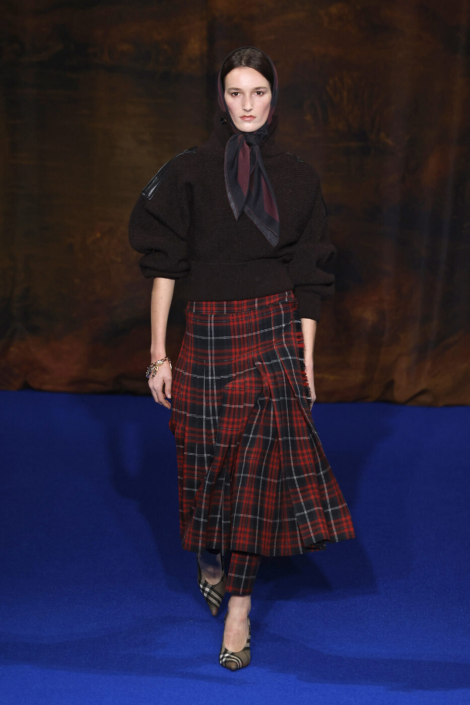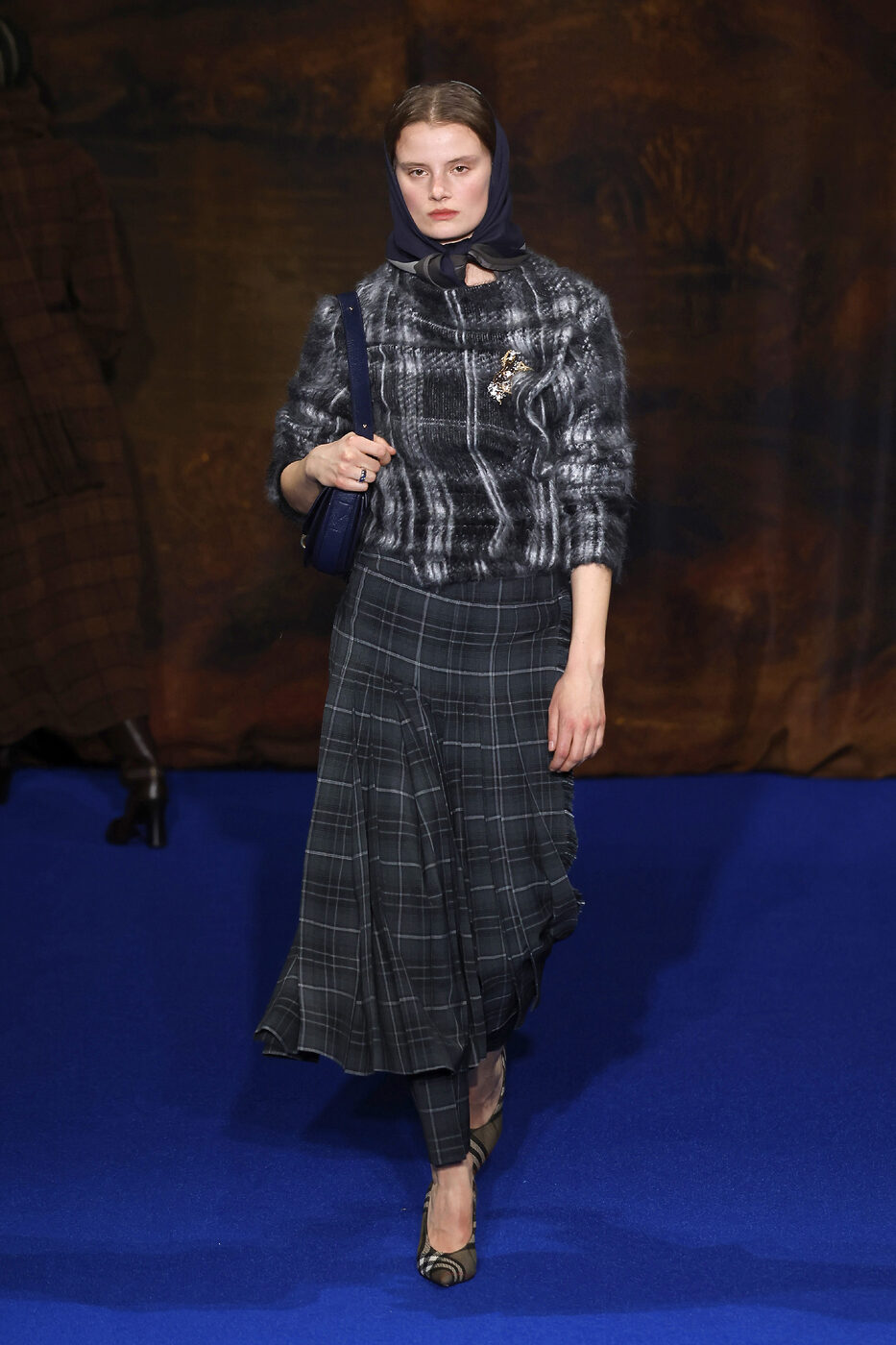 버버리는 체크 패턴을 논할 때 빠질 수 없는 하우스죠. 이번 2025 F/W 컬렉션에서는 타탄 체크를 롱 플리츠 스커트로 풀어내며 버버리 특유의 절제된 품격을 보여줬습니다. 머리부터 발끝까지 톱, 스커트, 슈즈를 모두 체크로 완성한 룩 역시 세련되면서 강렬했죠.