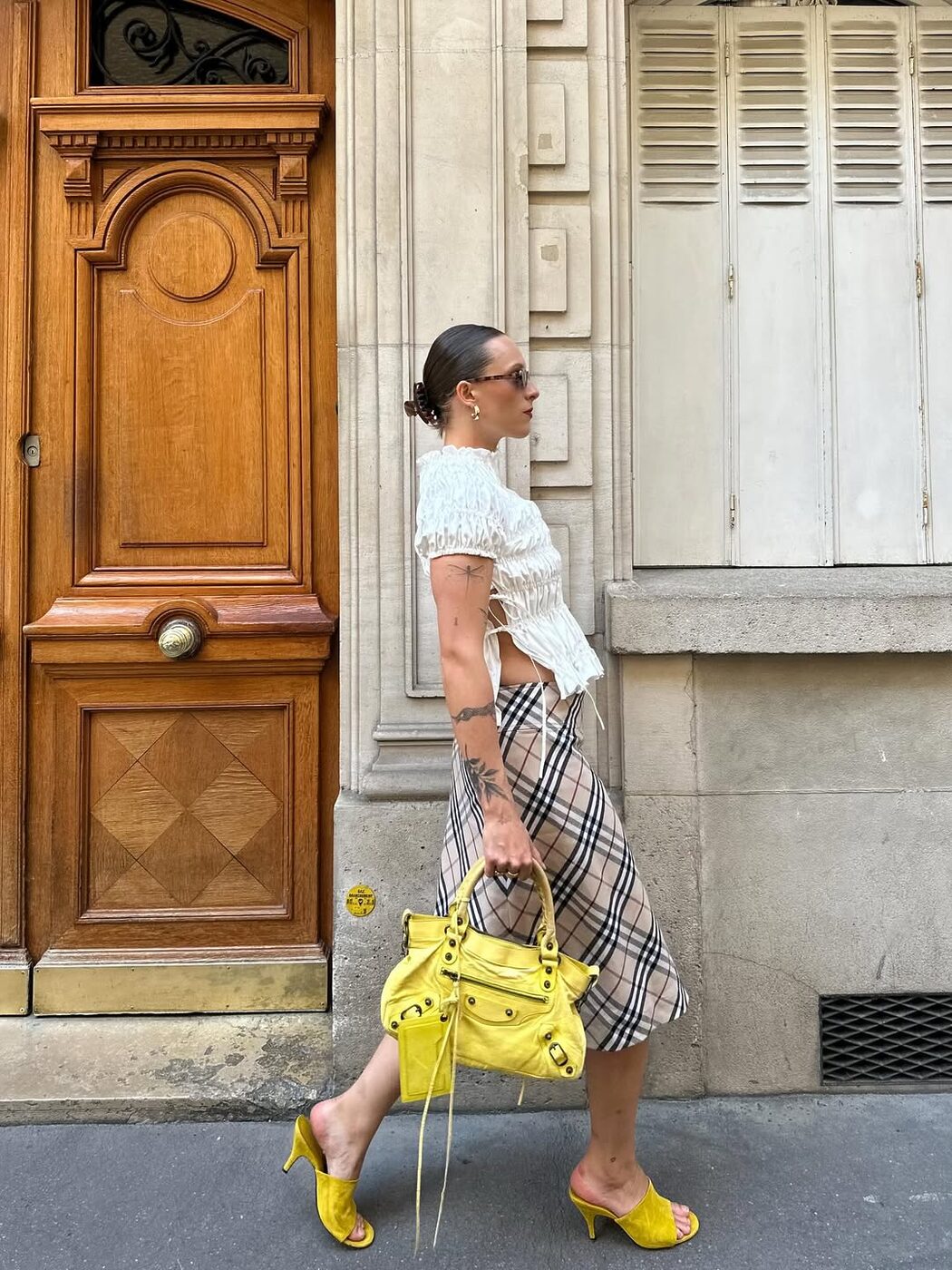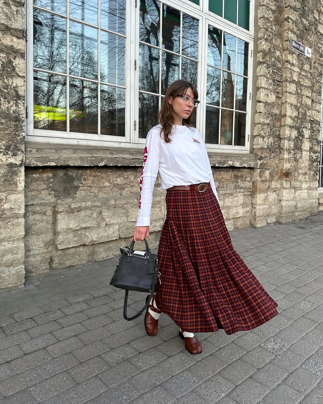 패션 인플루언서 알리나 마리아는 차분하면서도 걸리시한 체크 스커트에 롱 슬리브 티셔츠를 매치했습니다. 여기에 깔끔한 메리 제인을 더하니 지적인 분위기까지 느껴지죠. 브라운 컬러의 벨트로 심심하지 않게 포인트를 더한 센스도 눈에 띄었어요.