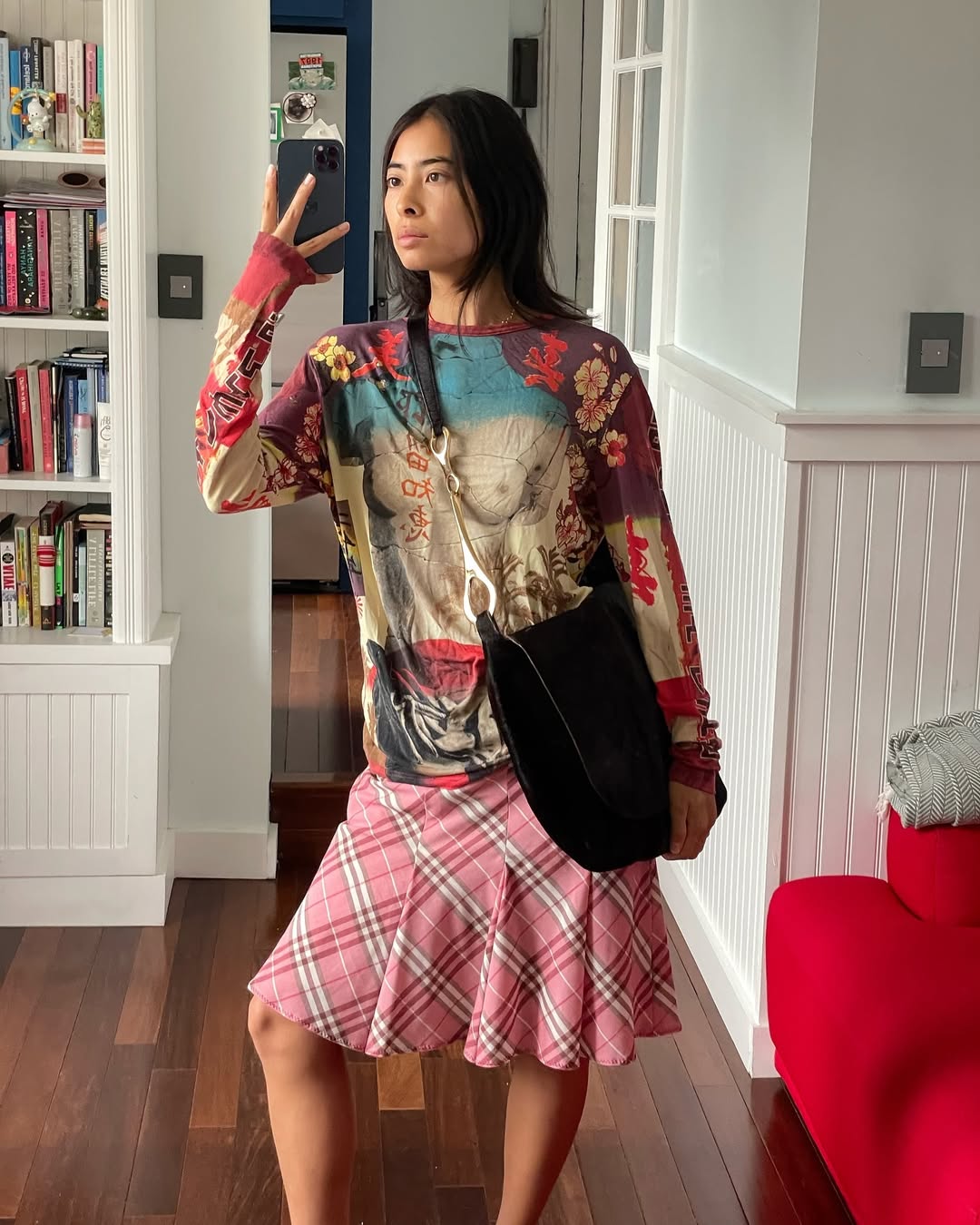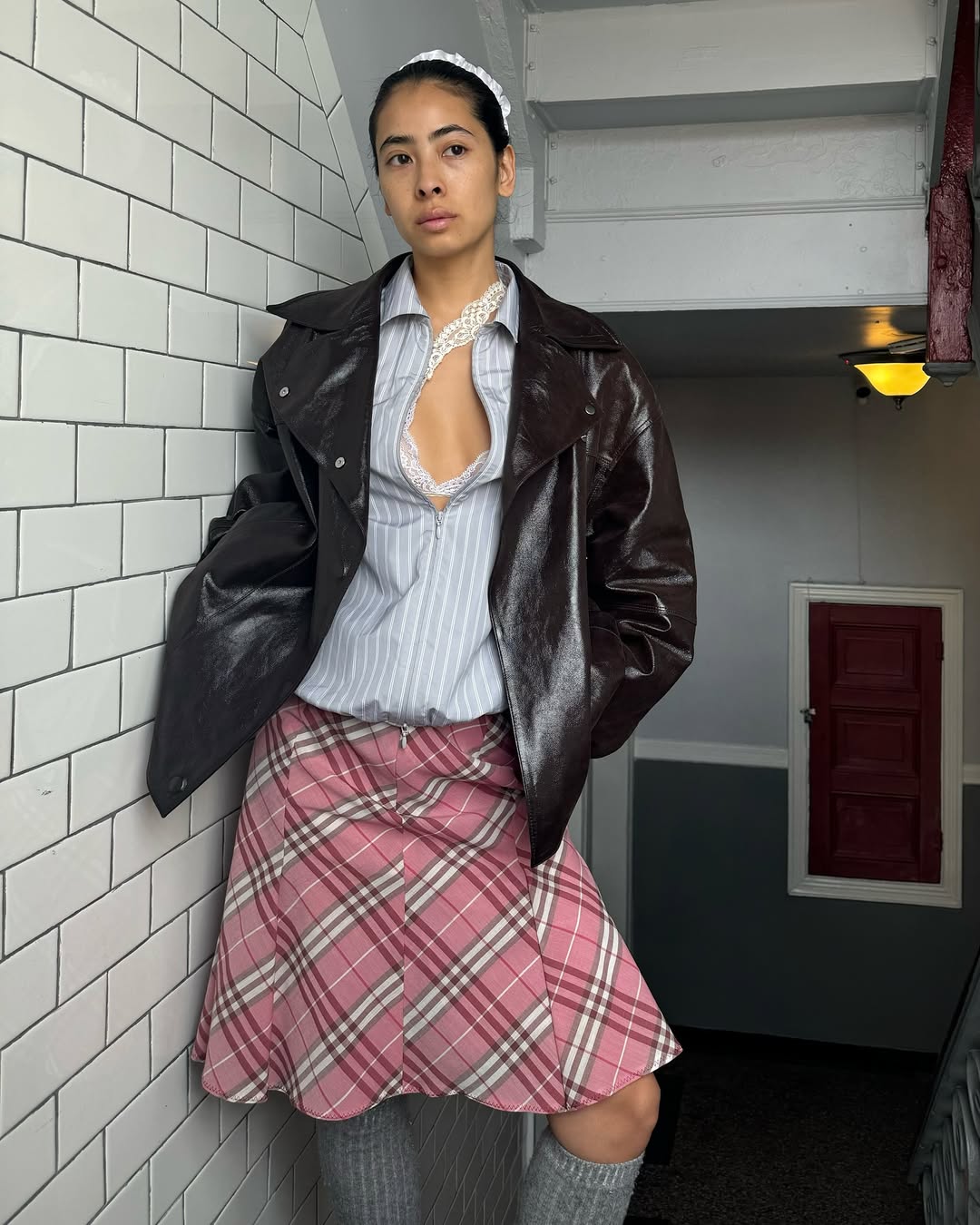 하나의 핑크 체크 스커트로 서로 다른 무드의 룩을 선보인 스타일리스트 미셸 리. 레이스 브라톱을 드러낸 셔츠에 레더 재킷을 더해 쿨한 바이브를 연출하고, 동양적인 아트가 프린팅된 티셔츠와 함께 키치한 감성을 드러내기도 했어요.