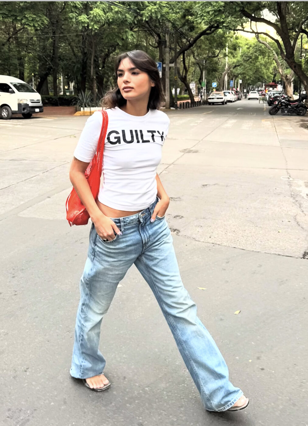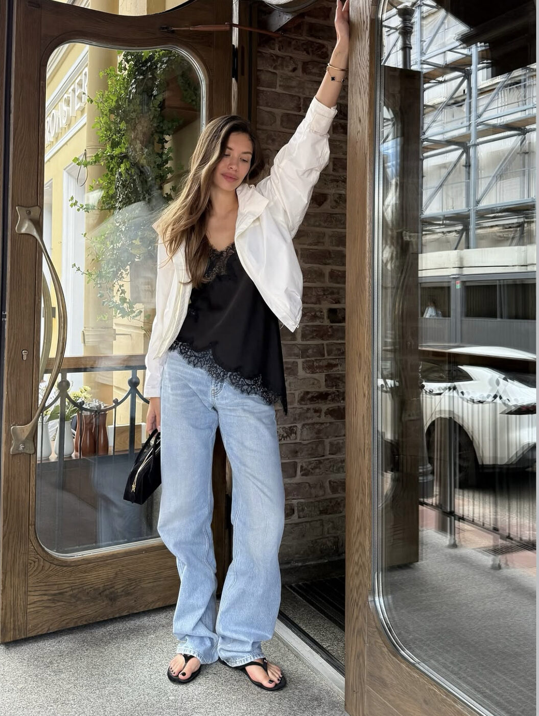 레이스 트리밍의 실크 캐미솔에도 이 밑단이 헐렁한 나팔 실루엣의 청바지를 입어보죠. 데님 팬츠의 길이가 더 길수록 더 세련된 자태를 자랑합니다. 여기엔 가을이 와도 여전히 미련을 버리지 못한 플립플롭으로 여유로운 분위기를 연출했어요. (@by_eva_)