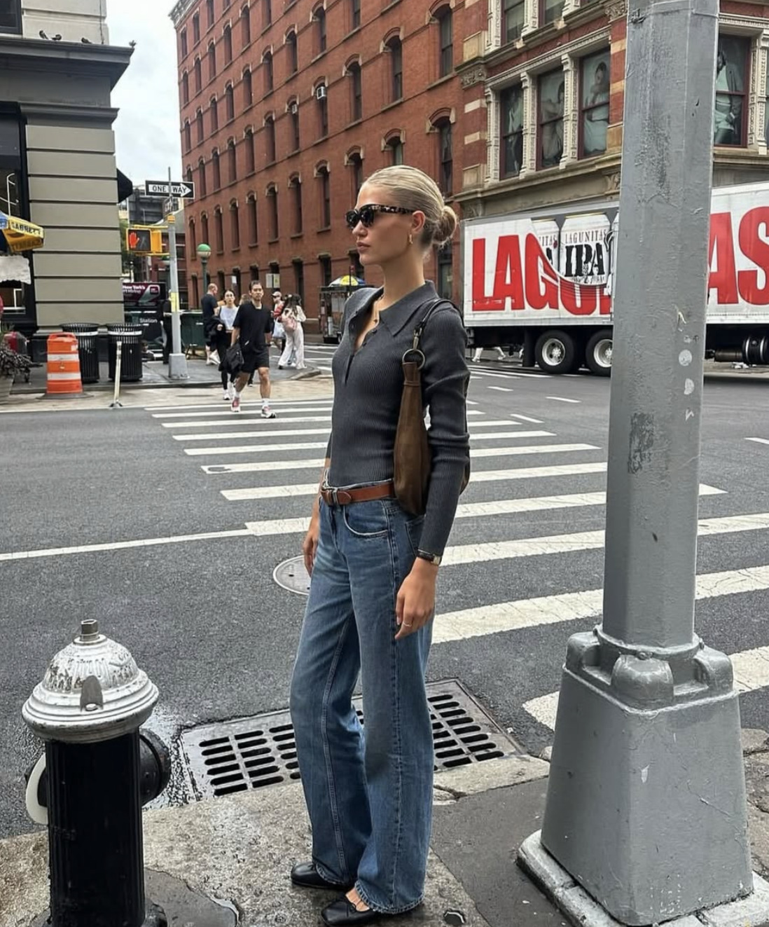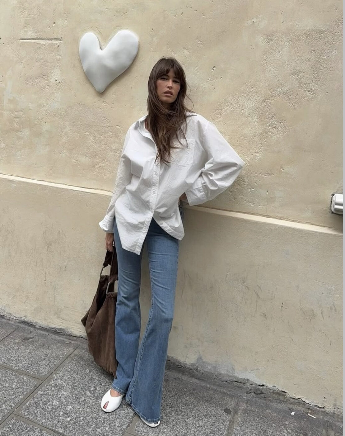 진정한 멋쟁이는 온 몸에 힘을 빼고 옷을 입습니다. 오버사이즈 셔츠를 풀어헤쳐 자연스럽게 연출하고 여기엔 잘 빠진 플레어진을 매치했어요. 화이트 셔츠와 매칭을 이룰 화이트 오픈토 슈즈로 시선을 사로잡았죠. 커다란 브라운 스웨이드 백으로 가을 느낌을 물씬 낸 이 심플하고도 패셔너블한 자태에 자꾸만 눈길이 갑니다. (@alisontoby)