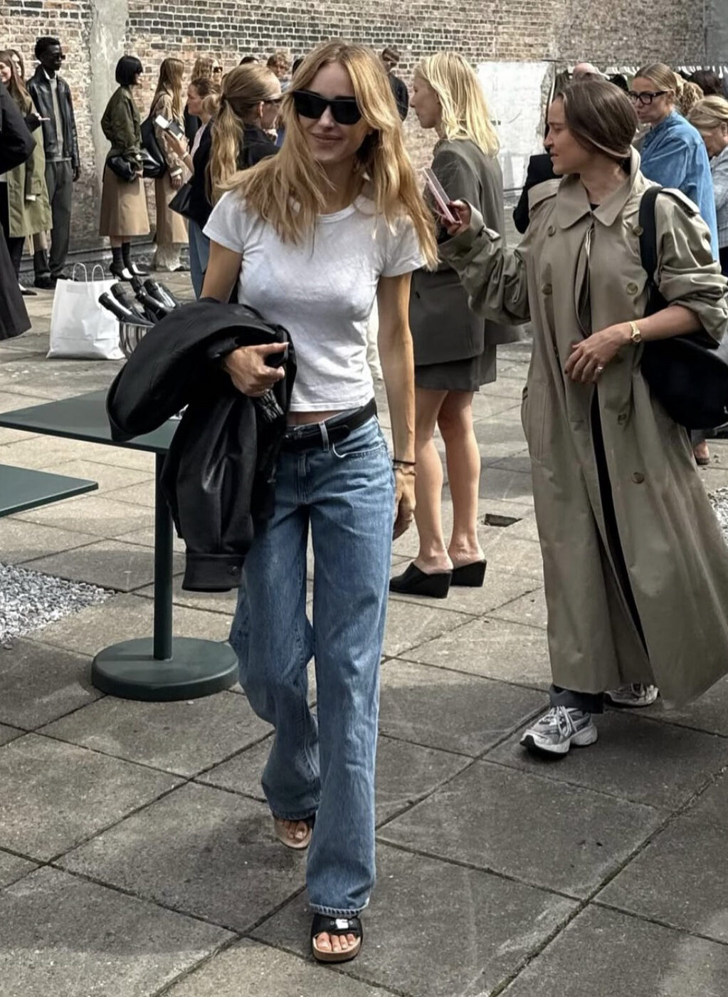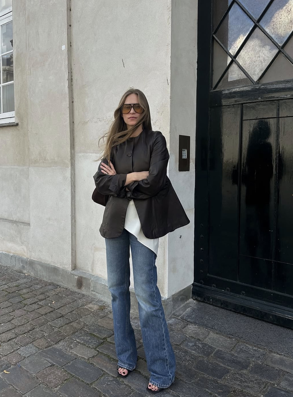 이 플레어진을 더욱 효율적으로 입으려면 하이힐의 샌들을 신어주세요. 펌프스보다 더 쿨한 분위기를 내는 힐은 다리를 길어 보이게 해줍니다. 여기에 재킷 마저도 허리 아래로 살짝 퍼지는 플레어 라인을 입어준다면 더욱 완벽한 조화를 이룹니다. (@tineandreaa)