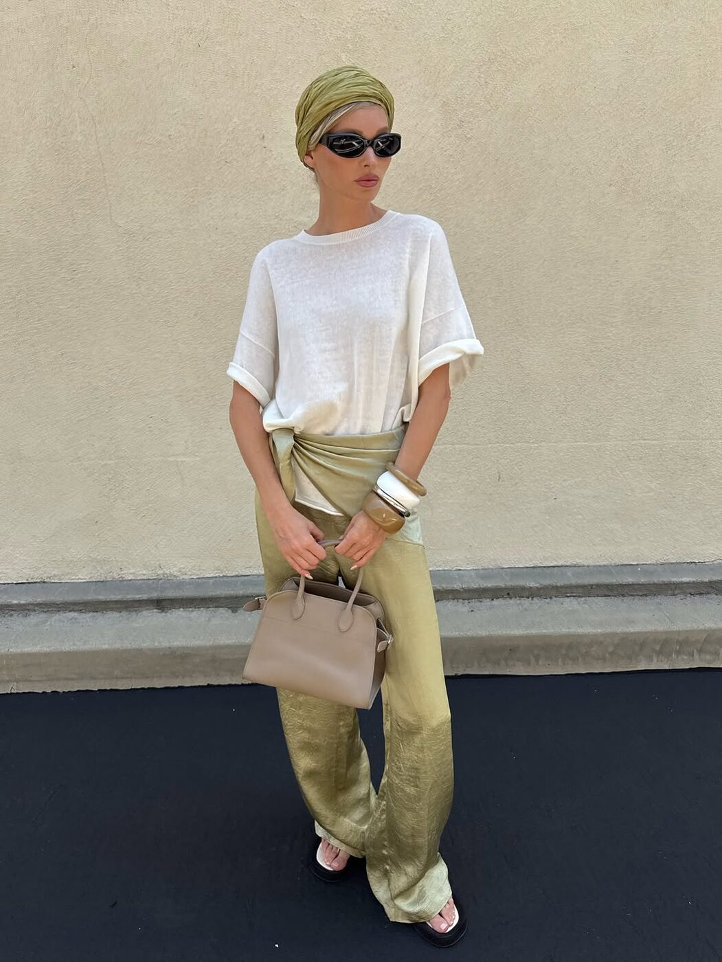 두르는 레이어드 방식을 한 군데만 고집할 필요가 있을까요? 베아트리시는 크로셰 니트를, 엘사 호스크는 올리브 빛 실크 스카프를 머리와 허리에 둘러주었습니다. 팬츠와 컬러를 맞추면 겹겹이 둘러도 세련되게 즐길 수 있죠. 리타 몬테주마는 이미 레이어드한 레이스 스커트와 같은 소재의 스카프를 목에 둘러 포멀한 룩에 여성스러움을 더했는데요. 가볍게 덧대는 것만으로도 룩의 입체감이 살아나는 것은 물론 무드도 한층 깊어졌죠.