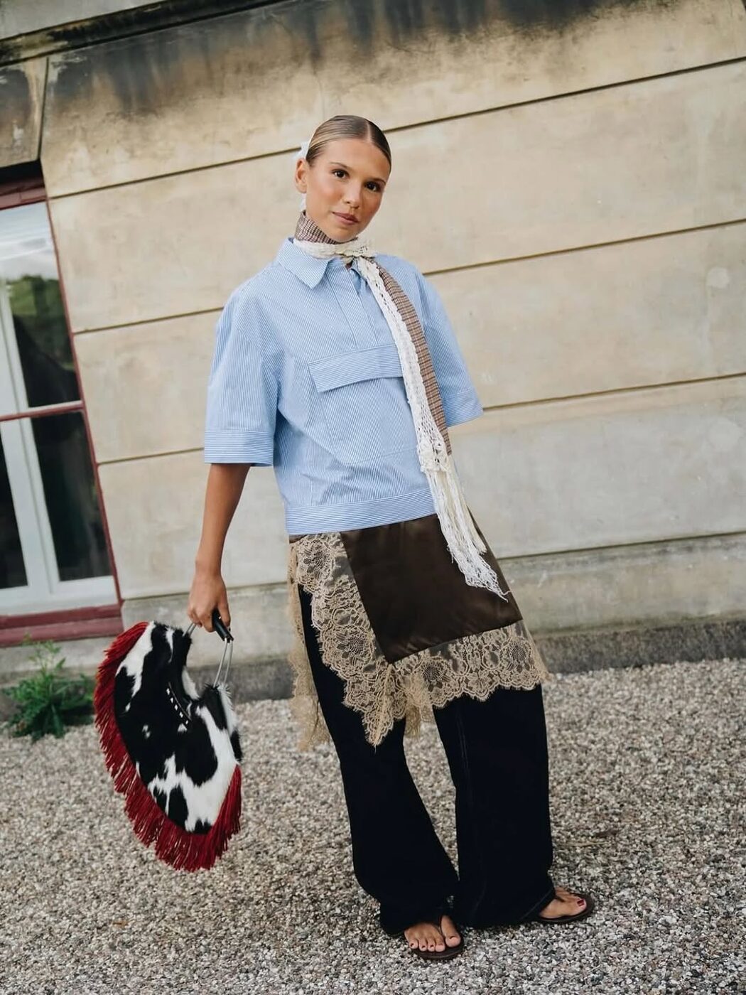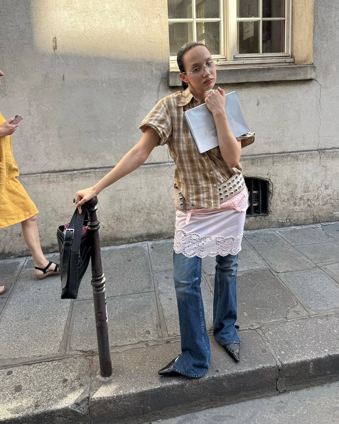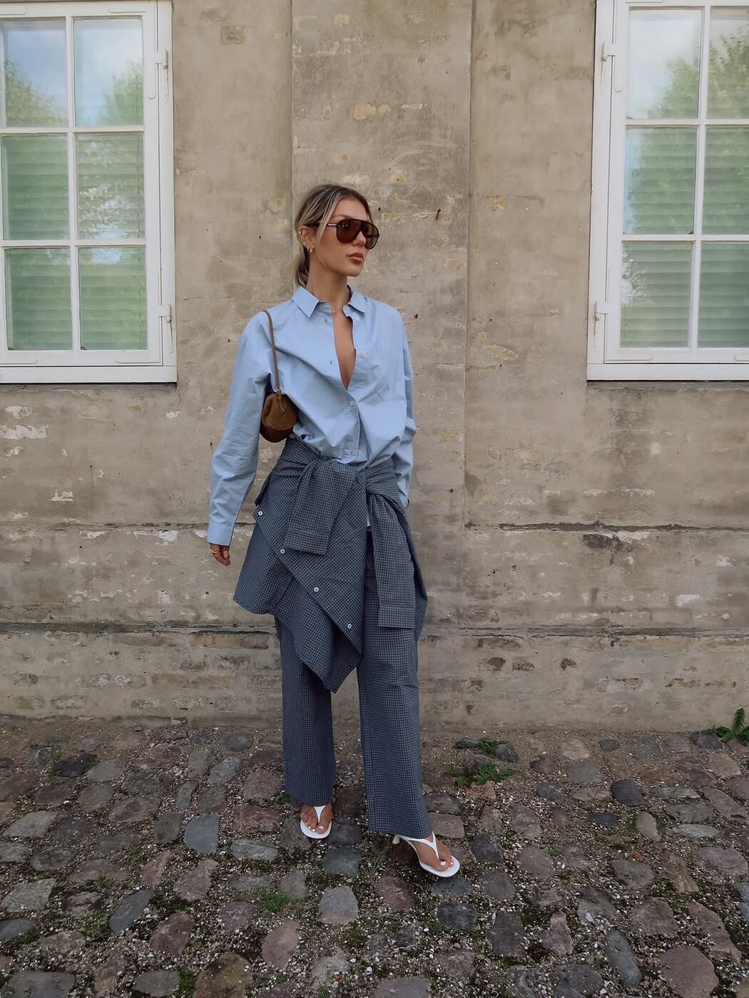 스카프를 두르는 트렌드 이전엔 셔츠가 있었습니다. 물론 지금도 여전히 유용한 레이어드 아이템 중 하나죠. 줄리아 소켈레는 셔츠 위에 또 다른 셔츠를 겹쳐 입는 대신 체크 팬츠와 같은 셔츠를 마치 스커트처럼 둘러 신선한 변주를 주었군요. 움직일 때마다 잡히는 구조적인 실루엣이 룩을 더욱 드라마틱하게 완성했습니다.