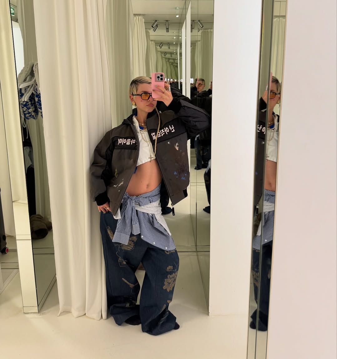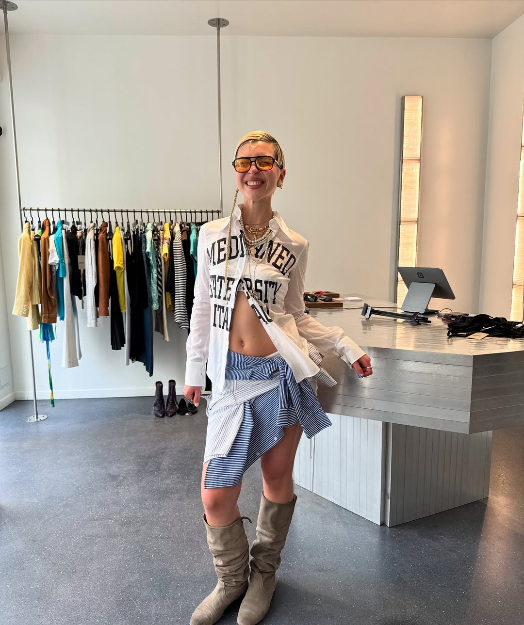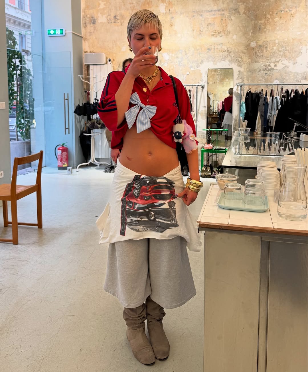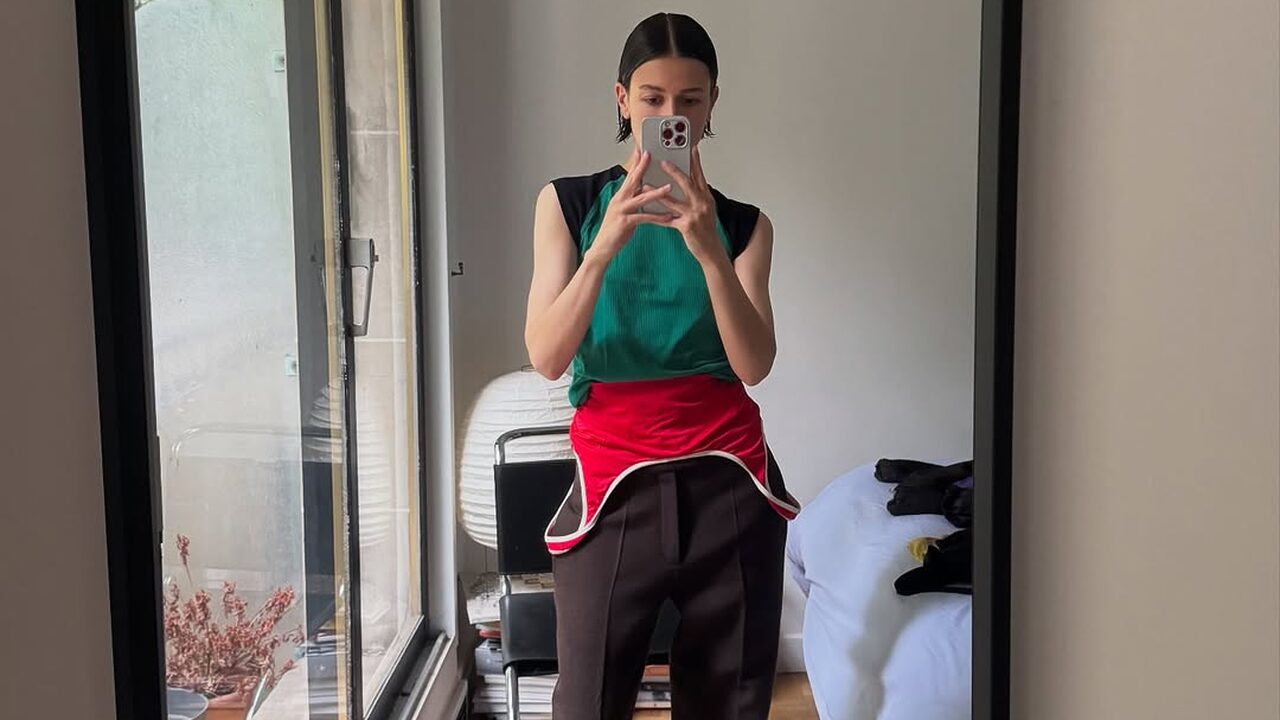 스카프를 두르는 트렌드 이전엔 셔츠가 있었습니다. 물론 지금도 여전히 유용한 레이어드 아이템 중 하나죠. 줄리아 소켈레는 셔츠 위에 또 다른 셔츠를 겹쳐 입는 대신 체크 팬츠와 같은 셔츠를 마치 스커트처럼 둘러 신선한 변주를 주었군요. 움직일 때마다 잡히는 구조적인 실루엣이 룩을 더욱 드라마틱하게 완성했습니다.