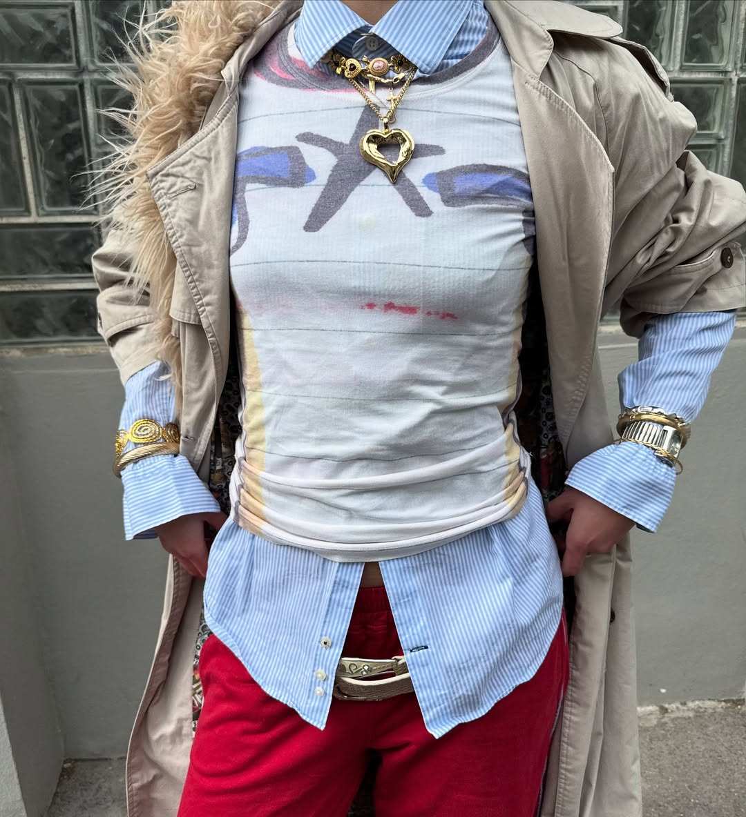 발렌티나는 스트리트 패션에 레이어링을 더한 개성 있는 스타일을 보여주는데요. 그중 눈길을 끄는 건 셔츠 활용법이죠. 빈티지한 티셔츠도, 단정한 셔츠도 두 겹으로 허리에 둘러 스커트처럼 연출하거나 액세서리를 돋보이게 하기 위해 셔츠 칼라와 커프스 위에 거침없이 주얼리를 두르기도 합니다. 레이어드의 고수답게 액세서리 역시 하나로는 만족할 리 없는 그녀. 진주는 진주끼리, 골드는 골드끼리 자유분방한 스타일 속에도 규칙을 이루며 투 머치 패션을 감각적으로 소화해 냅니다.