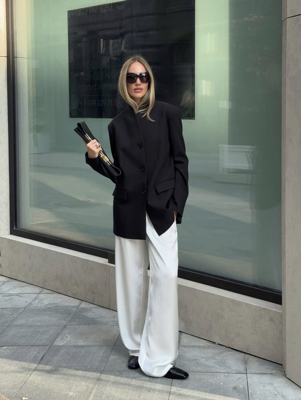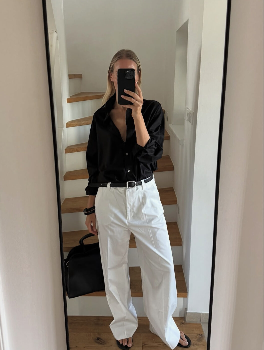 블랙 상의와 화이트 팬츠. 새로운 건 없지만, 또 이 조합을 대체할 만한 것도 없습니다. 셔츠 단추를 몇 개 풀면 주말 외출에 충분하고, 같은 팬츠에 로퍼를 신으면 출근룩에도 무난하죠.