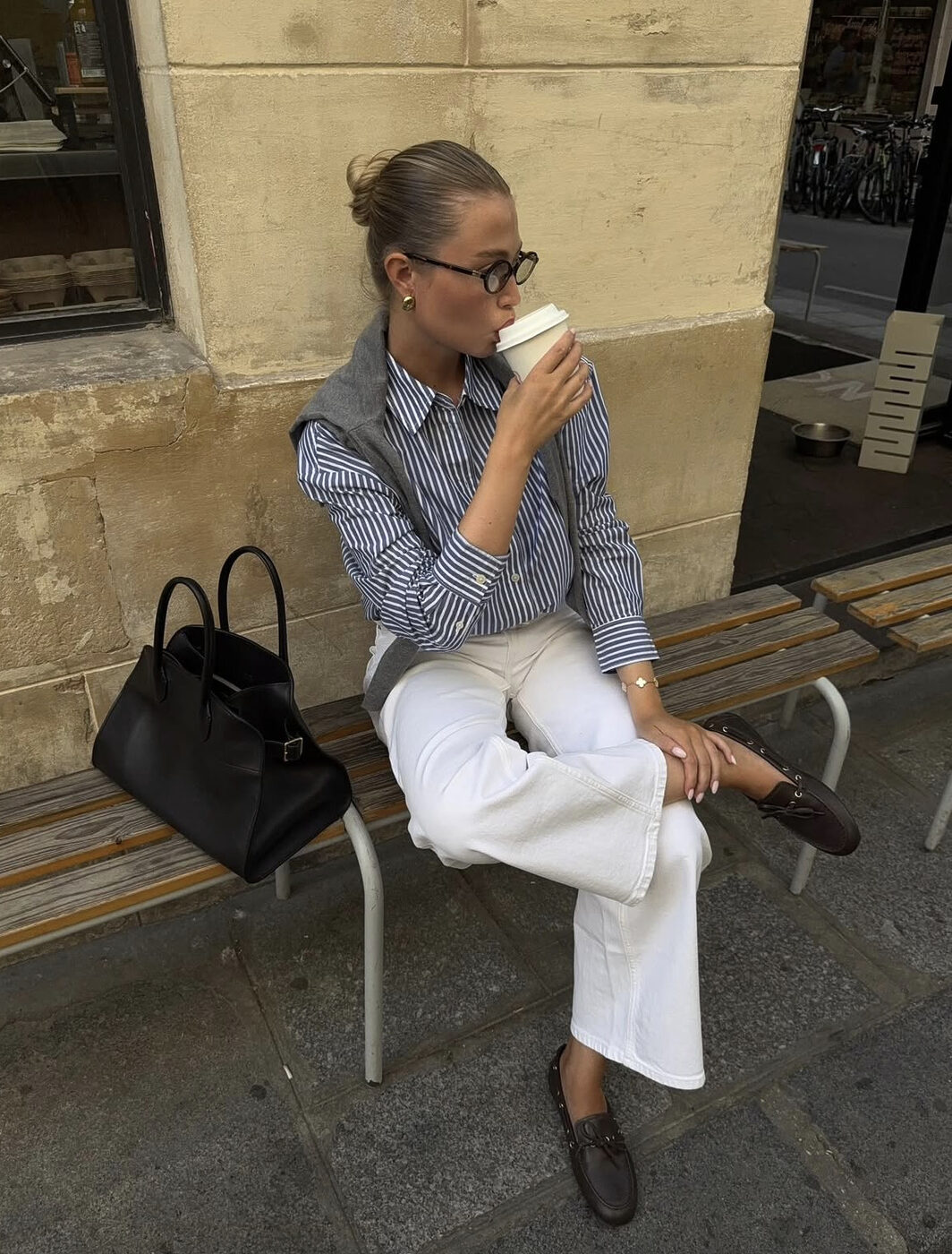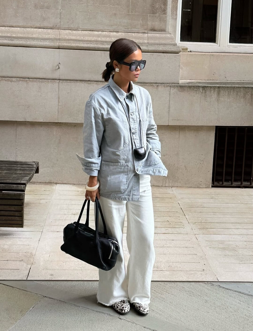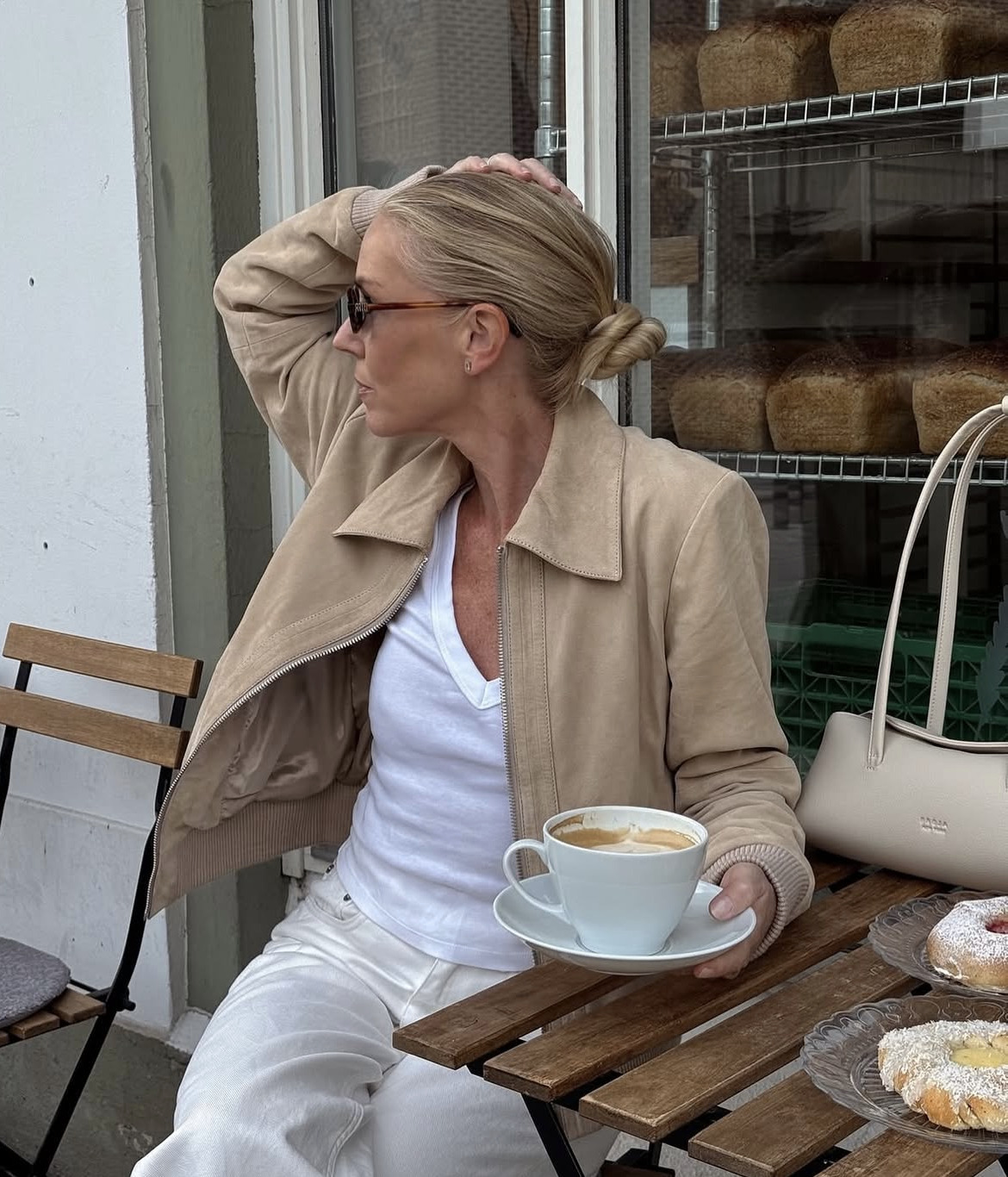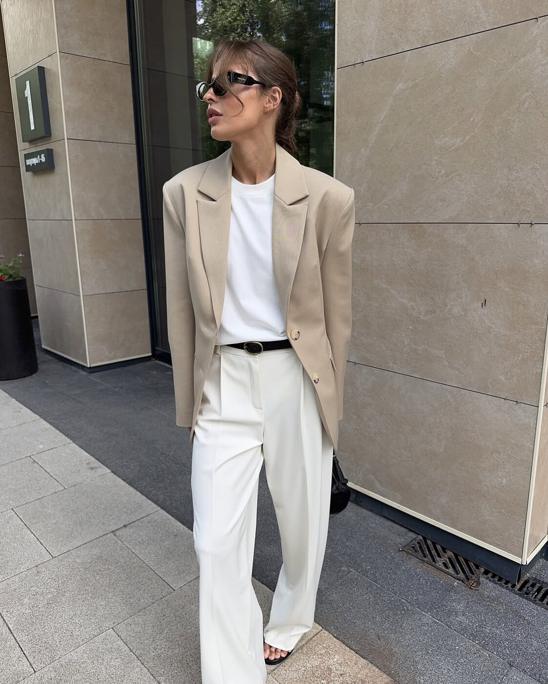 그래도 역시 가장 실용적인 답은 베이지 블레이저입니다. 단추를 끝까지 잠그는 대신 허리에 가느다란 벨트를 더해 라인을 드러내면, 겉으로 보기엔 큰 힘을 들이지 않은 듯하지만 고급스러움이 충만하죠. 브라운 백이나 블랙 소품을 더하면 색감의 온도가 한 단계 내려가면서, 화이트 팬츠의 화사함이 오히려 또렷해집니다.