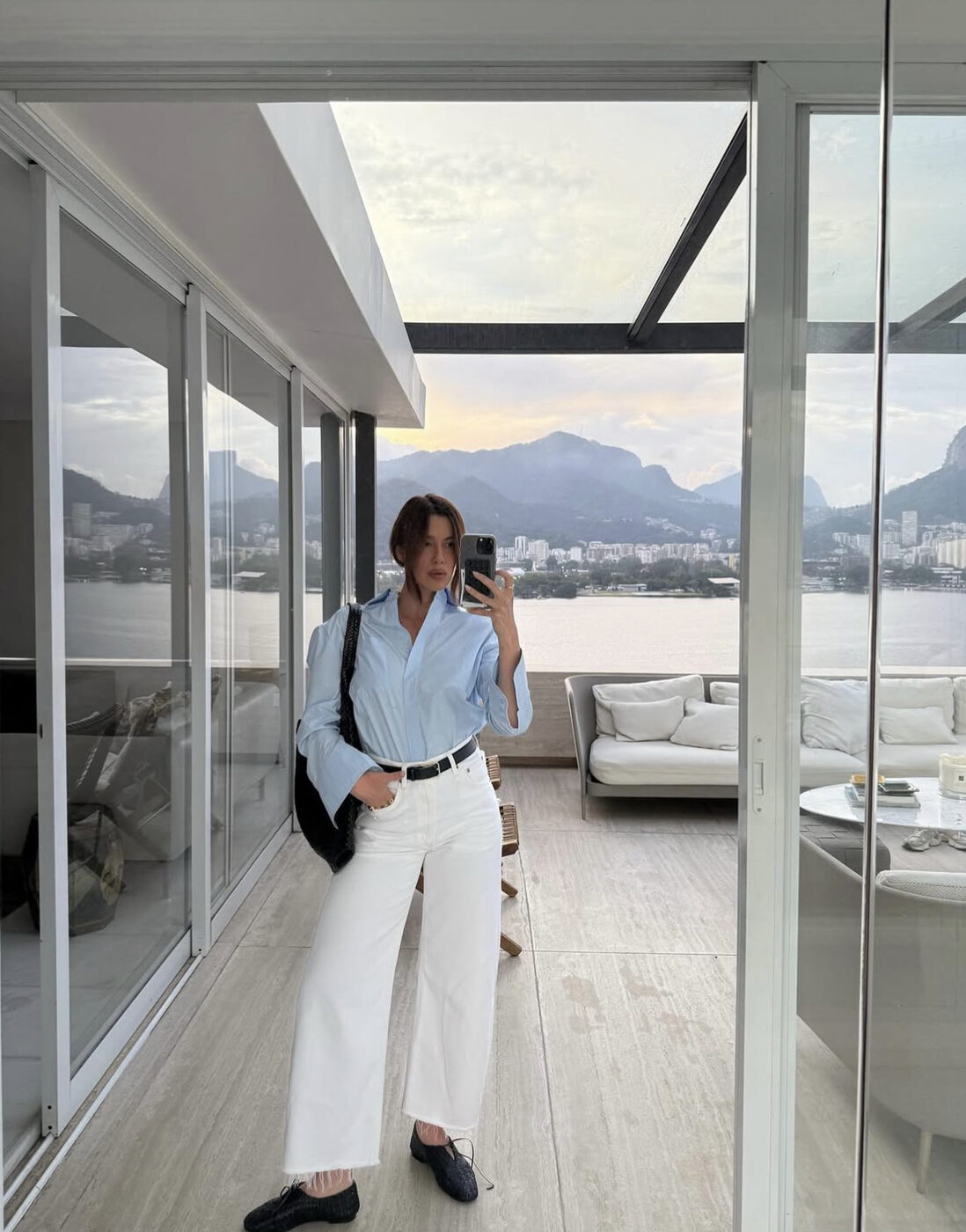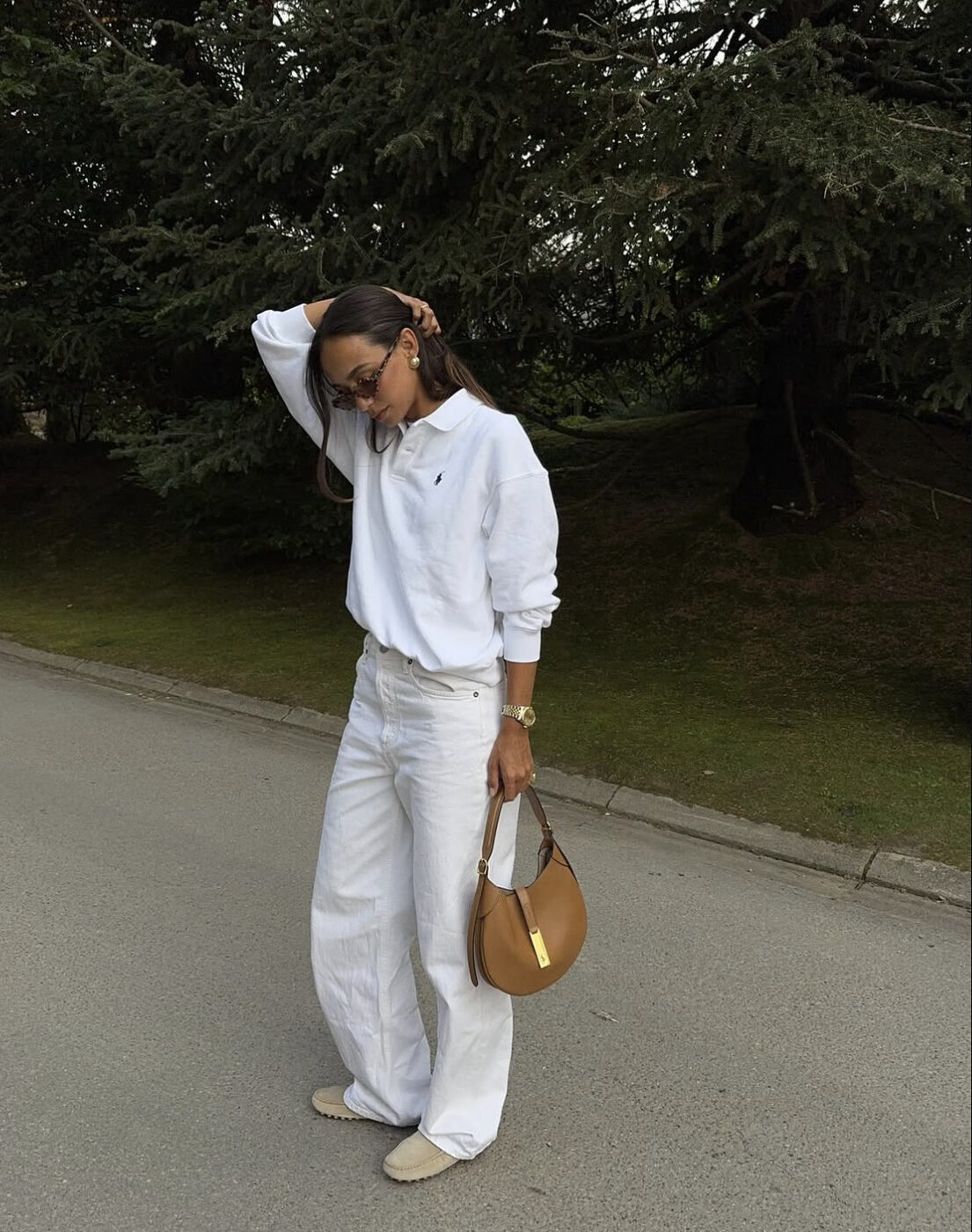 상하의를 모두 화이트로 맞추는 건 여전히 도전적인 선택입니다. 하지만 그만큼 사진에서 가장 예쁘게 남는 조합이기도 하죠. 액세서리로는 브라운이나 크림 컬러가 적합합니다. 가방이나 슈즈를 통해 컬러 톤을 살짝 눌러주면 초가을의 선선한 공기와도 어울리죠.