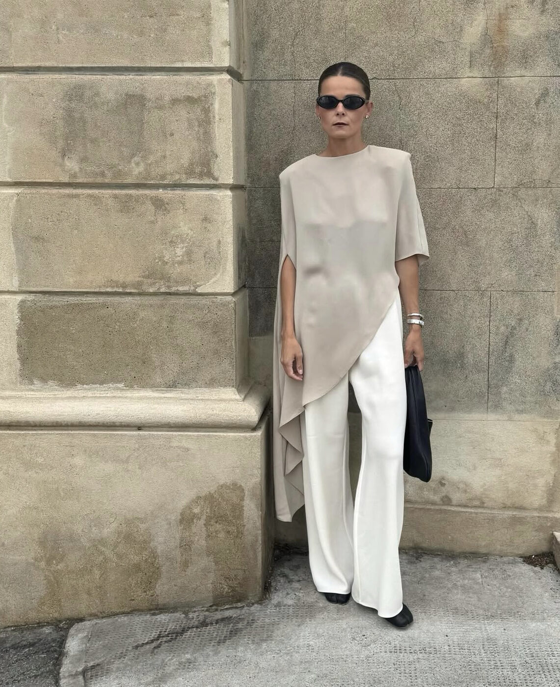 화이트 팬츠는 뉴트럴 아우터와 만나면 한결 차분해집니다. 계절이 바뀌는 시점에 색을 과하게 더할 필요는 없으니까요. 여름엔 덥다는 이유로 외면했던 베이지나 카멜 톤이 초가을엔 자연스러운 선택이 됩니다. 비대칭 톱 같은 구조적인 상의와도 잘 어울리고요. 화이트 팬츠가 바탕을 단순하게 잡아주니 상의의 독특한 절개나 언밸런스한 실루엣이 과하지 않게 드러나는 거죠. 이런 조합에는 발등이 드러나는 뮬이나 미니멀한 힐을 매치하면 시선이 아래까지 자연스럽게 이어집니다.