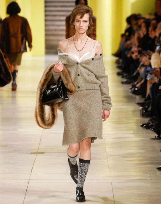 단정함과 퇴폐미의 한 끗 차이를 보여준 미우미우의 셋업 룩. 클래식한 베이지 니트 카디건과 펜슬 스커트 세트는 평범함 속에 시크함을 무장했습니다. 카디건 속에 화이트 시스루 브라 톱을 입고 슬쩍 어깨를 내려 입은 발칙함이 시선을 사로잡죠. 현실에서 이런 과감한 스타일링이 어렵다면 그저 니트 소재의 톱과 스커트 셋업만으로도 충분합니다. 단 양말에 로퍼를 신어준다면 말이죠.