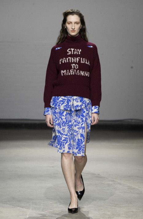 펑크와 빈티지를 적절하게 섞은 최고의 간절기 룩이 되겠군요. 영국 디자이너다운 레트로 감성을 담은 하늘색 플라워 패턴 드레스에 갈색 터틀넥 니트를 레이어드 했습니다. 여기엔 귀엽게 메시지도 담았어요. 하늘거리는 스커트 혹은 스쿨 걸 느낌의 플리츠 스커트에도 잘 어울릴 스웨터, 청바지에 로퍼만 신어 준다면 이번 가을 시그니처 룩이 완성됩니다.