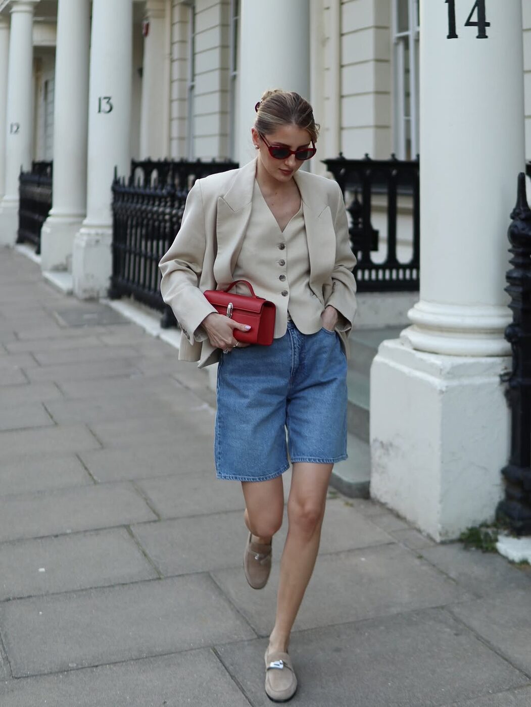 좀 더 가벼운 인상의 오피스 룩을 원한다면 베이지 컬러의 베스트와 재킷 셋업을 데님 쇼츠에 더하는 것도 방법입니다. 이때 전체적으로 룩이 심심해 보일 수 있으니 컬러 포인트가 되는 액세서리를 잊지 마세요.