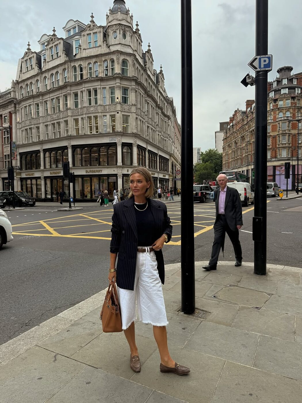 데님으로 좀 더 클린한 출근룩을 연출하고 싶다면 화이트 데님 쇼츠를 골라 블랙 & 화이트 조합을 꾀해보는 것입니다. 여기에 너무 볼드하지 않은 주얼리들을 더해주면 모던하지만 럭셔리한 터치까지 더할 수 있죠.