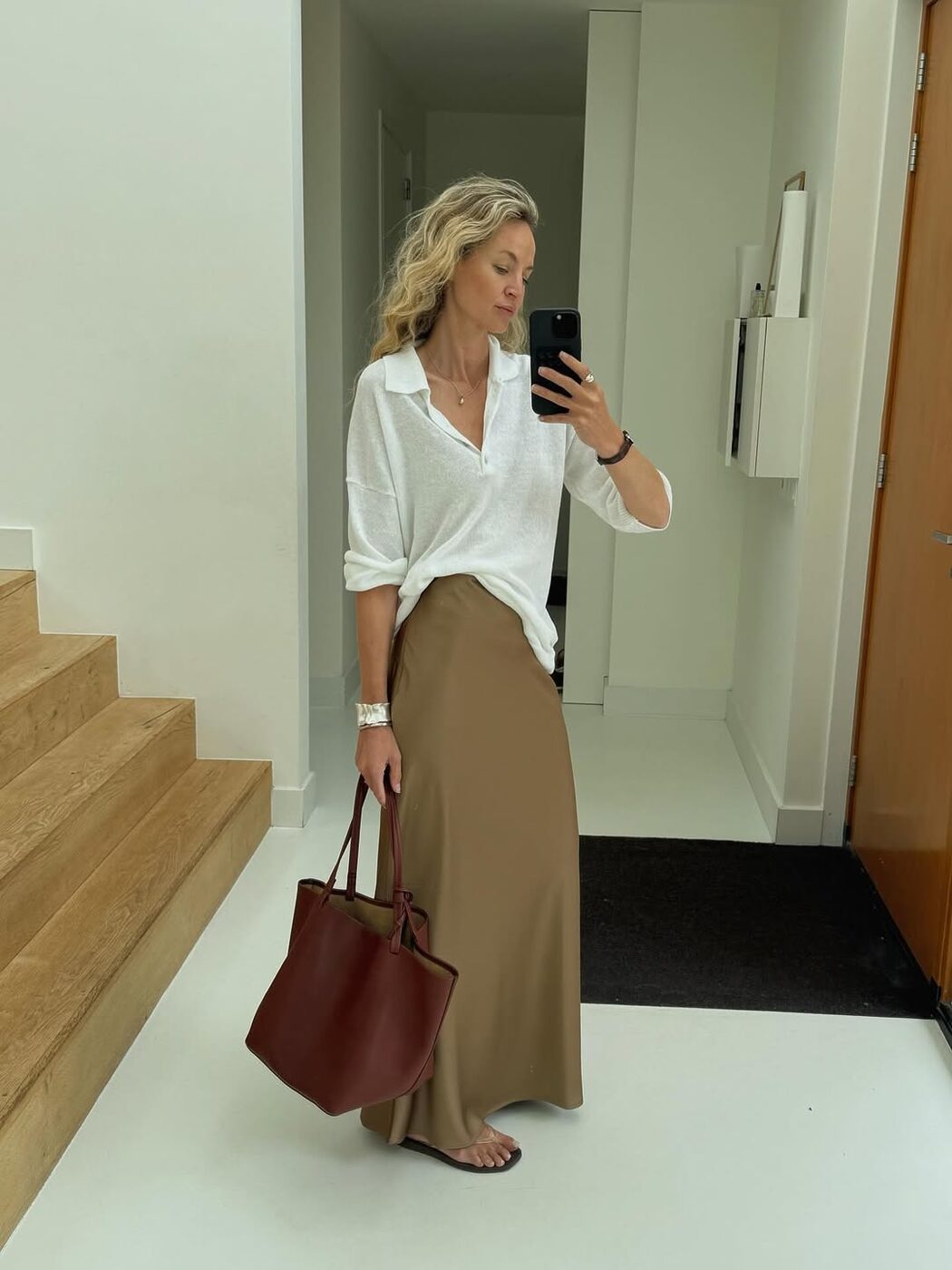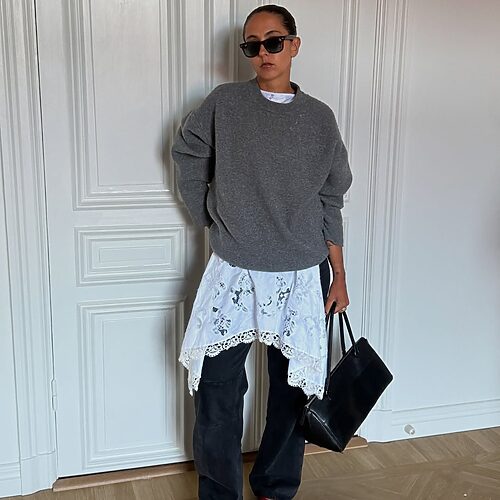 심플한 롱 슬립 드레스는 미니멀한 무드로 레이어드 해 보세요. 얇은 니트나 롱슬리브 티셔츠와 함께 입으면 마치 슬립 스커트를 매치한 듯 깔끔한 톤 앤 매너가 완성되죠. 자칫 심심해 보일 수도 있는 조합이지만 상의 밑단과 소매를 자연스럽게 말아 올리고 볼드한 액세서리를 더하면 포인트를 줄 수 있죠.