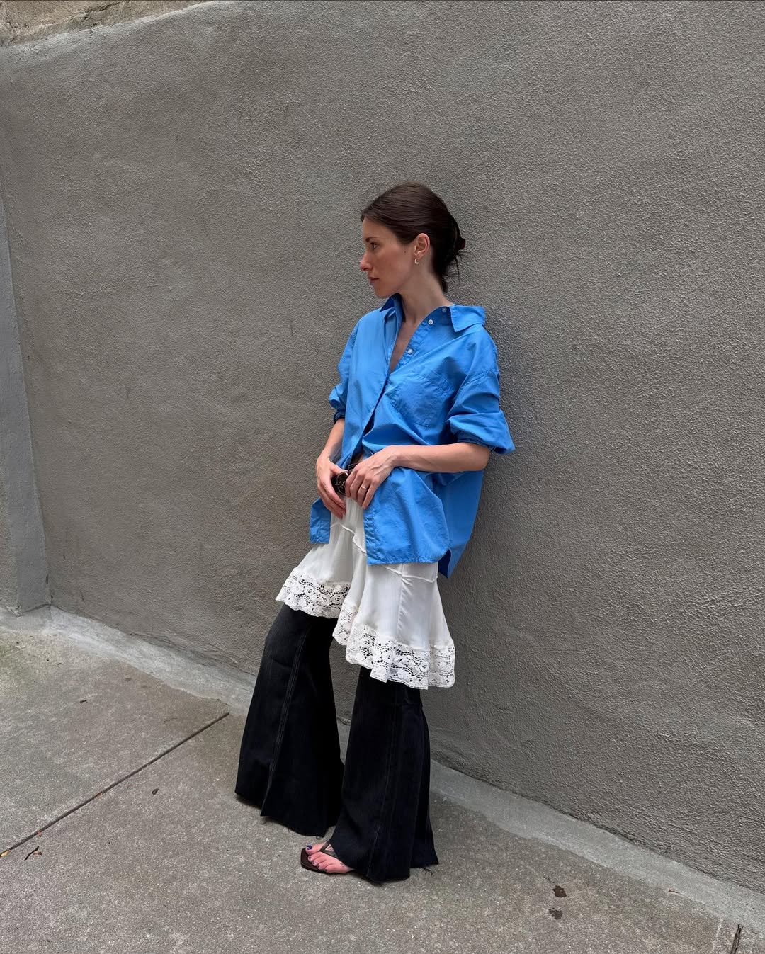 애매한 길이의 미디 슬립 드레스는 팬츠와 레이어드해 보세요. 부츠컷 팬츠 위의 하늘하늘한 슬립 드레스가 너무나도 세련돼 보이죠. 드레스를 단독으로 입을 땐 다소 애매할 수 있는 길이가 팬츠와 만나니 또다른 매력이 느껴지는데요. 상의는 클래식한 셔츠로 마무리하면 오피스 룩으로 응용할 수도 있답니다.