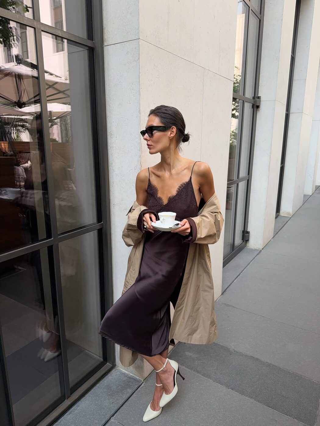 란제리 무드의 슬립 드레스를 색다르게 즐기고 싶다면 트렌치 코트와의 조합을 추천합니다. 슬립 드레스의 관능적인 분위기를 클래식 아우터가 중화해 주면서, 일상에서도 부담 없이 입을 수 있는 세련된 룩이 완성되죠.