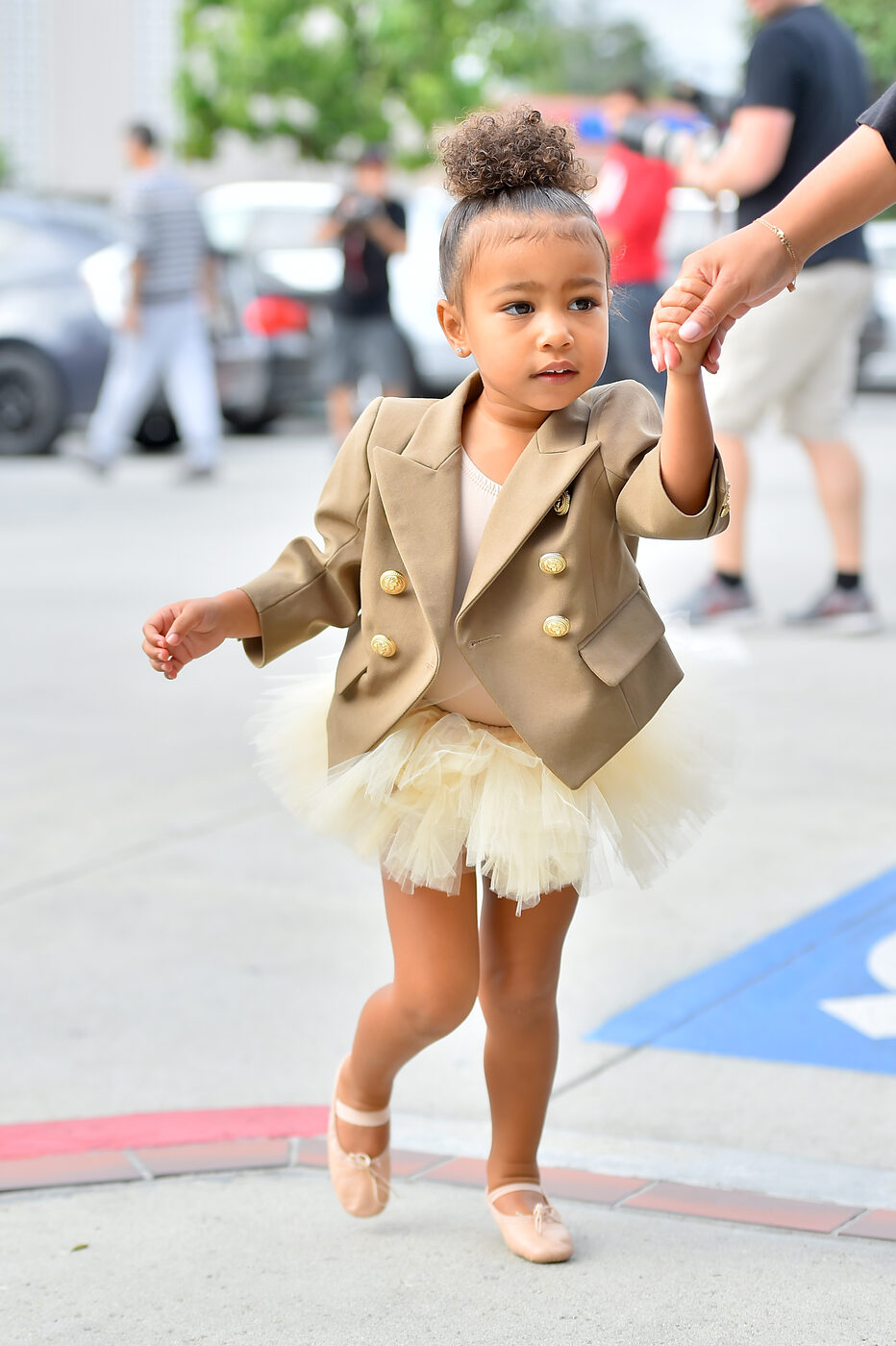 자, 먼저 10년전 엄마이 손을 잡고 나온 유아기의 노스 웨스트를 보고 가실게요. 인형 같은 깜찍함으로 무장한 그녀는 튜튜 스커트의 발레복과 발레 슈즈를 신고 귀여운 걸음을 옮겼습니다. 이때도 패션에 대한 감도는 일반적이진 않았죠. 골드 버튼 장식의 발망 재킷을 걸친 아이라니요! 엄마 킴 카다시안의 스타일이 느껴지는 선택이었습니다. 그럼에도 마냥 사랑스러운 모습이죠.