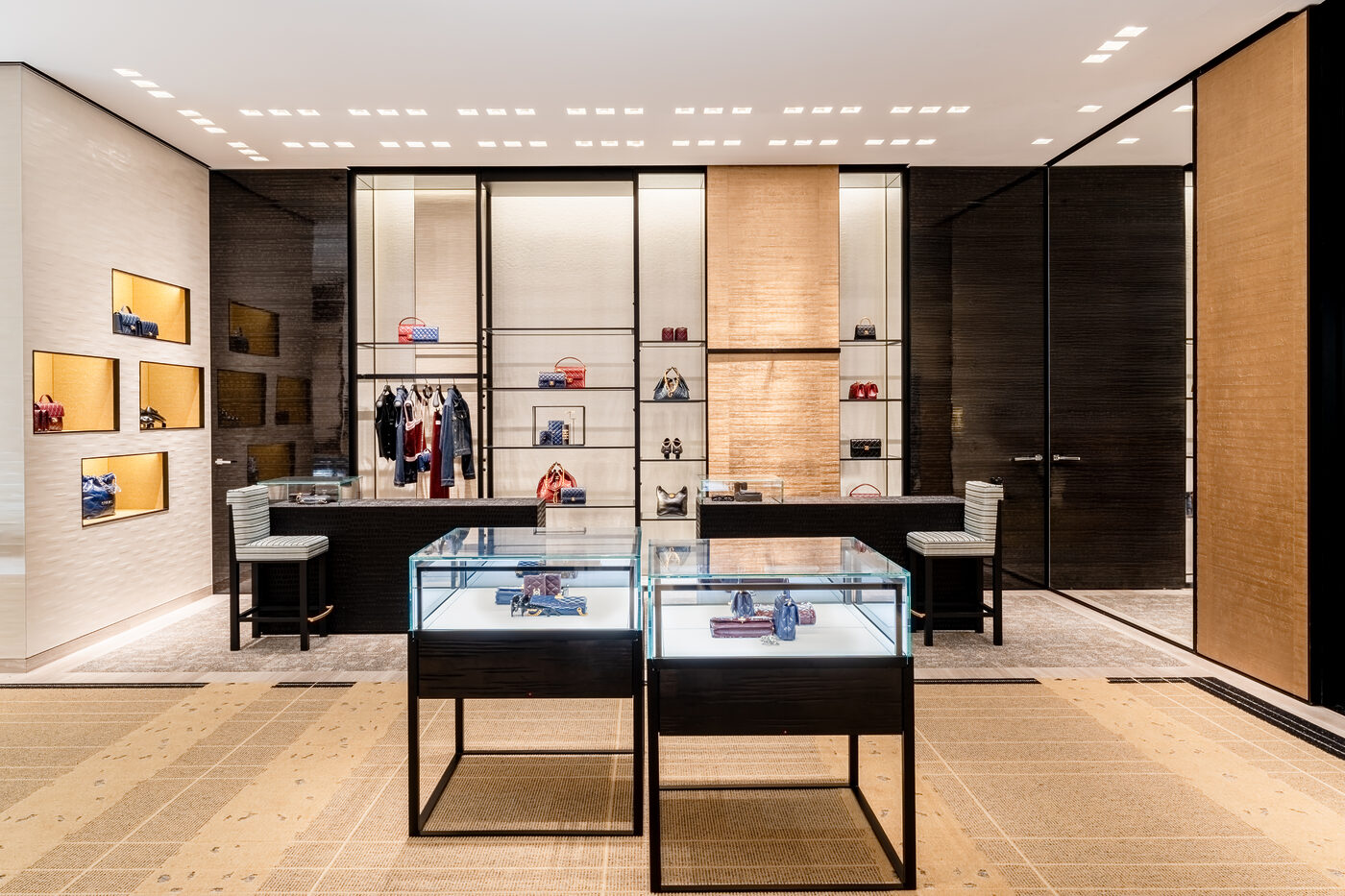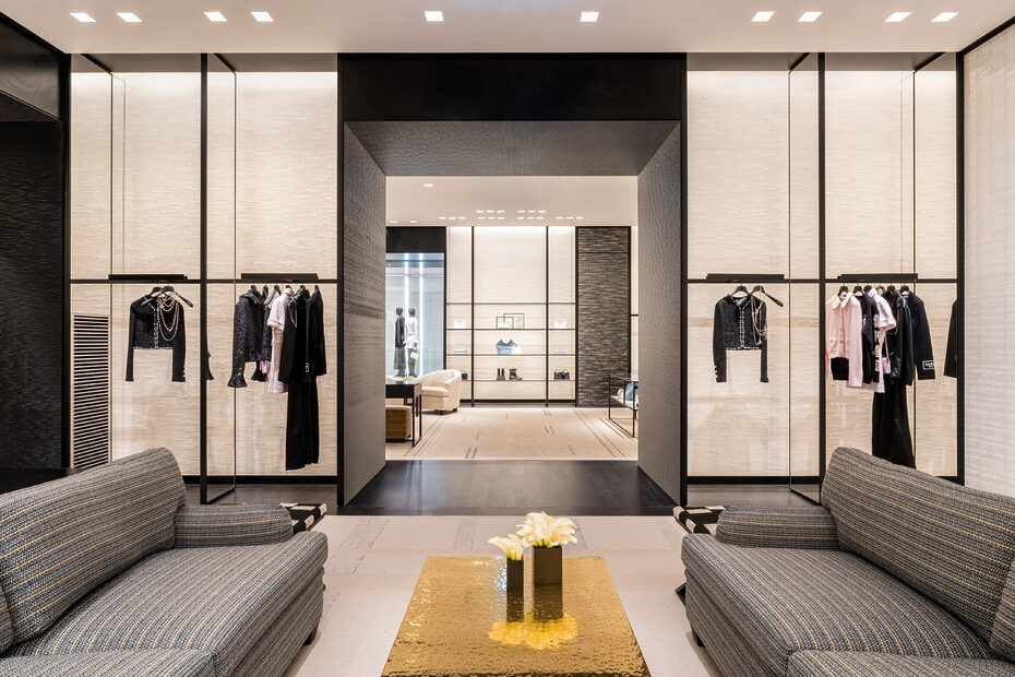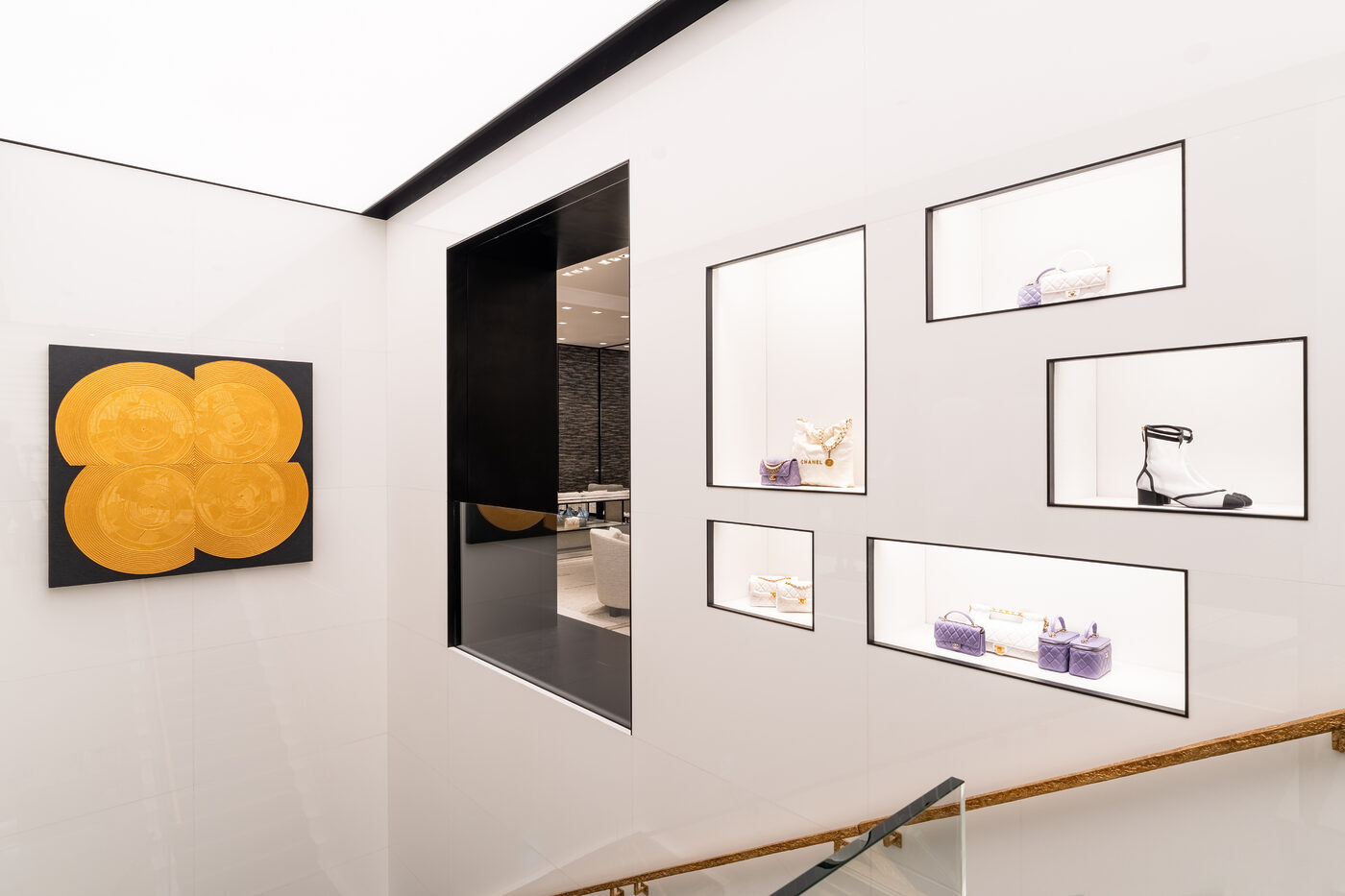 내부 공간도 마찬가지입니다. 샤넬의 아이코닉한 제품들은 모던한 인테리어를 배경으로 빛을 발하죠. 흰 벽을 배경으로 전시된 제품들은 블랙 컬러의 프레임이 감싸고, 블랙 컬러를 적용한 아치형 구조물과 창문, 포인트 벽면이 시선을 자연스럽게 유도하는 모습.