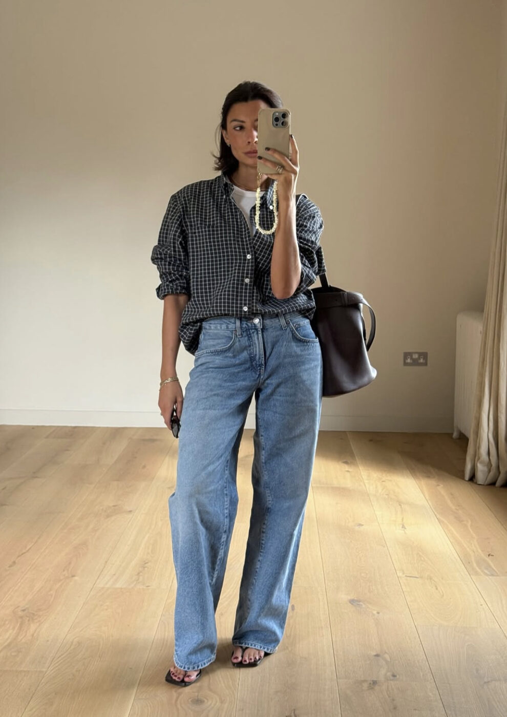 그레타 리처럼 매니시 무드의 패턴이 있는 셔츠는 쿨한 자태를 선사합니다. 블랙 앤 화이트의 체크 패턴 셔츠에 빈티지한 워싱의 일자 데님 팬츠를 입은 내추럴한 스타일링이 돋보이죠. 가을 분위기나는 브라운 레더 소재의 빅 숄더 백 하나 매주면 데일리 룩으로 제격이에요. (@smythsisters)