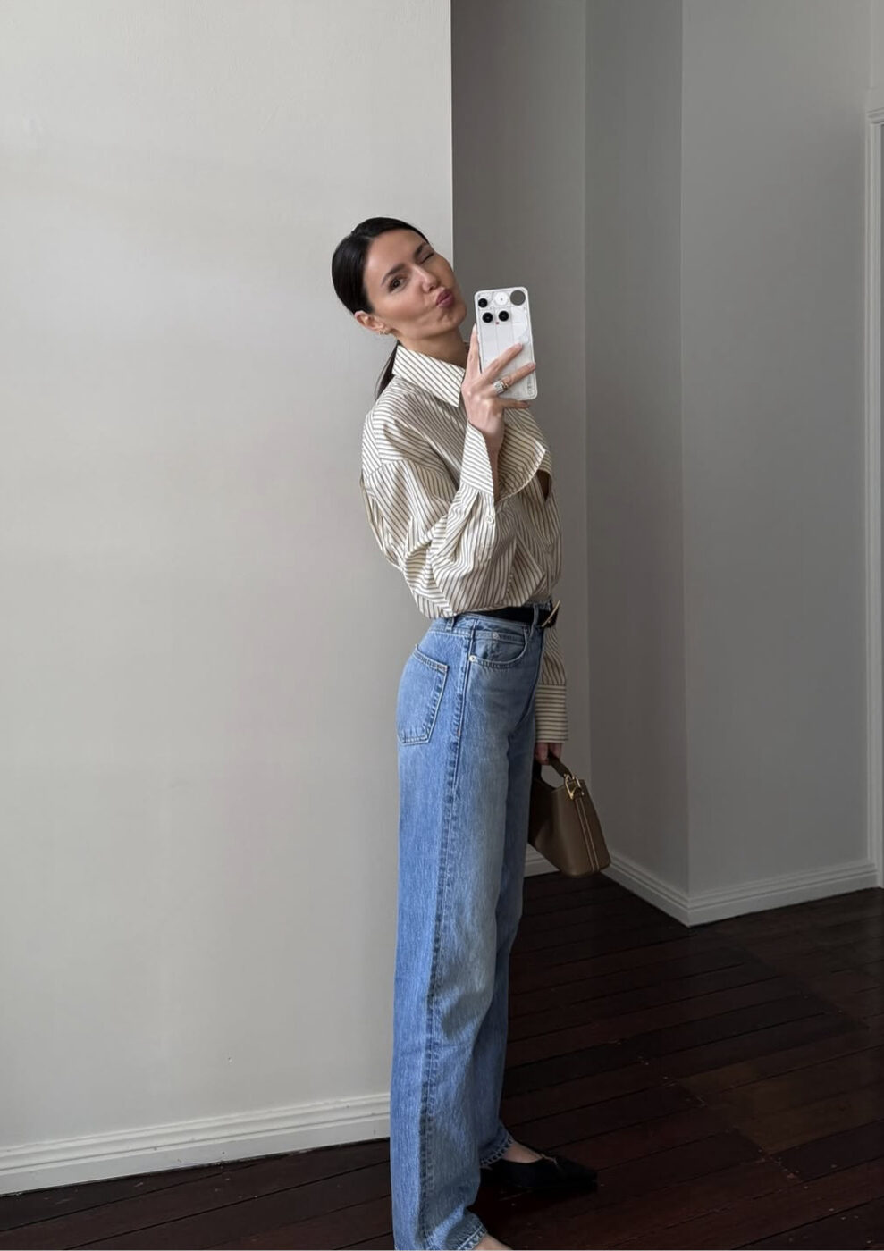 벨트를 활용하면 좀 더 단정한 느낌을 줄 수 있어요. 옐로우 톤의 스트라이프 셔츠에 연청을 입고 레더 벨트로 포멀한 스타일을 완성했습니다. 클래식한 토트 백으로 비즈니스 룩으로도 손색없을 옷차림이 완성되었어요. (@pepamack)
