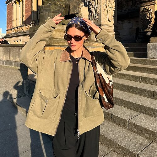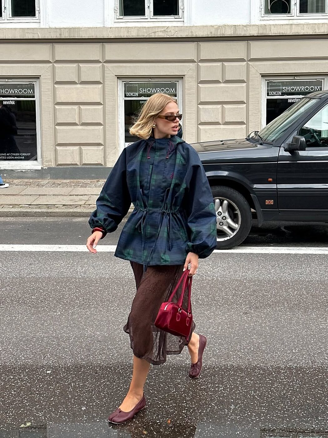 미디 길이의 윈드브레이커는 드레스업하고 싶은 날 활용하기 제격입니다. 허리를 잡아주는 스트링 디테일 덕분에 실루엣이 정돈되어 보이고, 시스루 레이스 스커트와 만나니 여성스러운 무드까지 더해졌죠. 린다는 버건디, 브라운, 그리고 그린이 어우러진 딥한 컬러 팔레트로 윈드브레이커 특유의 기능적 이미지를 덜어냈어요.