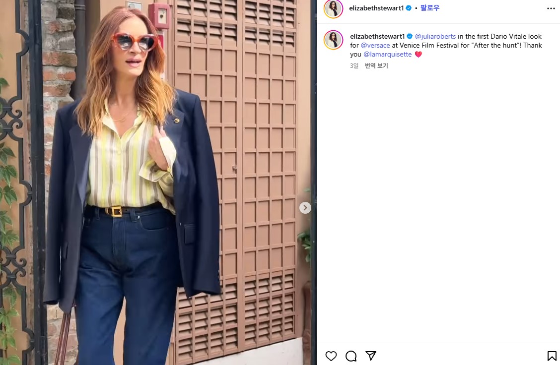 그런데 이 룩을 어떻게 아만다 사이프리드가 입게 되었을까요? 그 비하인드 스토리는 이렇습니다. 줄리아 로버츠와 아만다 사이프리드는 스타일리스트가 같은데, 둘의 스타일리스트인 엘리자베스 스튜어트가 줄리아 로버츠의 베르사체 착장 영상을 인스타그램에 올렸고 여기에 아만다가 ‘같은 옷을 입게 해줘요’라고 댓글을 달았죠. 아만다의 사랑스러운 요청에 줄리아 로버츠가 흔쾌히 OK를 한 건지 며칠 뒤 아만다는 이 룩을 입게 되었습니다. 귀여운 아만다와 쿨한 줄리아 로버츠 덕에 치열한 베니스 영화제에서 훈훈하고 에피소드가 만들어졌고, ‘일거양득’ 두 톱 여배우에게 드레싱을 하게 된 다리오 비탈레는 쾌재를 불렀겠군요!