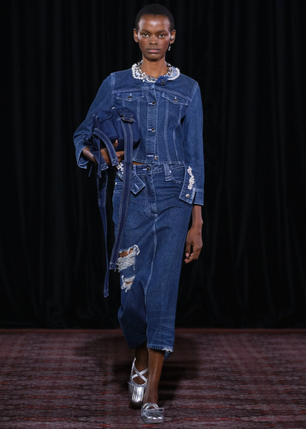 소녀 감성 충만한 시몬 로샤에서는 스티칭 디테일이 돋보이는 데님 재킷에 찢청의 매력을 더한 미디 스커트로 더블 데님 룩을 선보였습니다. 크롭 형식의 재킷에는 주얼리가 장식된 둥근 칼라를 달아 로맨틱함을 더했어요. 메탈릭한 실버 발레리나 슈즈까지 완벽한 데님 소녀로 변신했죠.