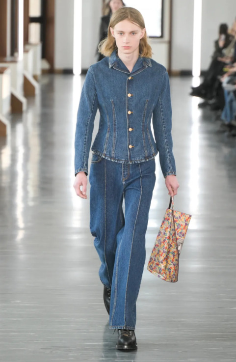 보이시한 분위기의 오버사이즈 데님 재킷과 와이드 핏의 데님 팬츠 룩 또한 이번 시즌 새롭게 주목할 만한 스타일이에요. 단정한 느낌의 스티칭 장식이 돋보이는 사각 형태의 재킷은 데님임에도 불구하고 포멀한 분위기를 선사합니다. 여기에 밑단을 접어 올린 턴업 팬츠는 투톤 효과를 주며 더 깔끔하고 모던한 효과를 주었죠. 바지 길이가 짧으면 경쾌하고 캐주얼하게, 길면 드레시한 하이패션 스타일링도 가능하답니다.