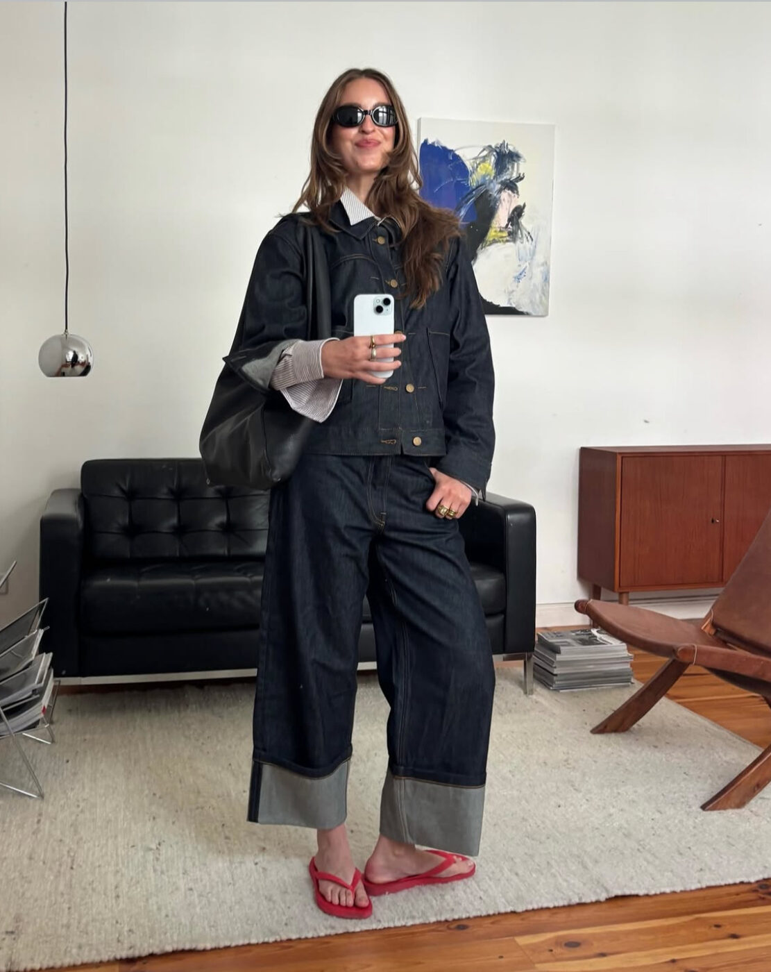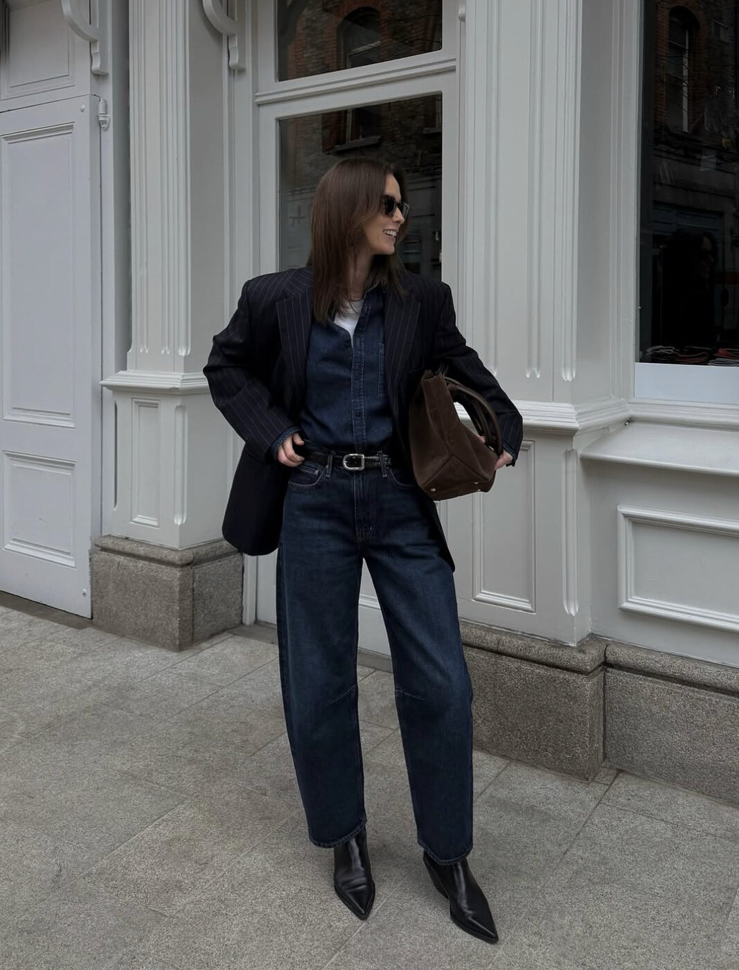날이 좀 더 서늘해 진다면 시도해도 좋을 더블 데님 룩과 블레이저 매칭이에요. 니트나 카디건보다 좀 더 색다른 무드의 스타일링을 원한다면 적당히 포멀하고 엣지 넘치는 데님 온 데님 룩이 제격입니다. 진한 데님 룩 위에 핀 스트라이프 블레이저를 입고 앵클 부츠를 신어 시크한 룩을 선보였어요.