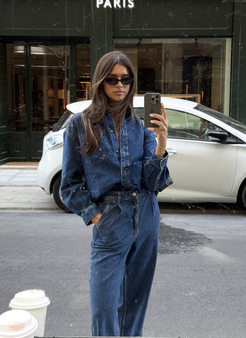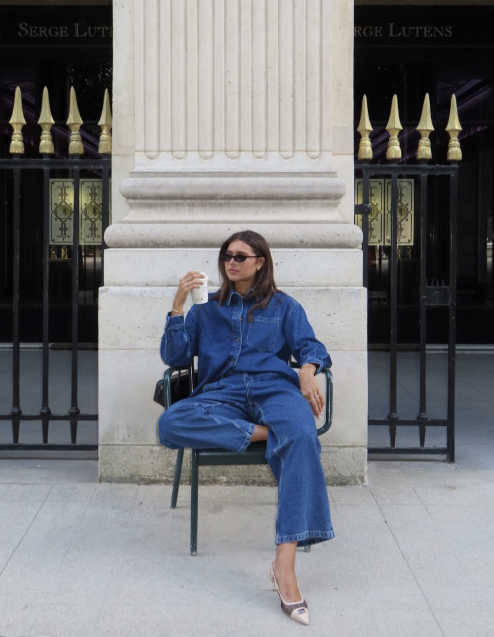가장 일반적으로 입을 수 있는 데님 셔츠에 데님 팬츠 룩. 이때 셔츠와 청바지의 데님 컬러를 똑같이 통일해 준다면 더욱 세련된 옷차림을 연출할 수 있어요. 별다른 장식과 액세서리가 없이도 그 자체만으로 특별한 데님 룩에는 앞 코가 뾰족한 펌프스를 신어 우아함을 더했습니다.