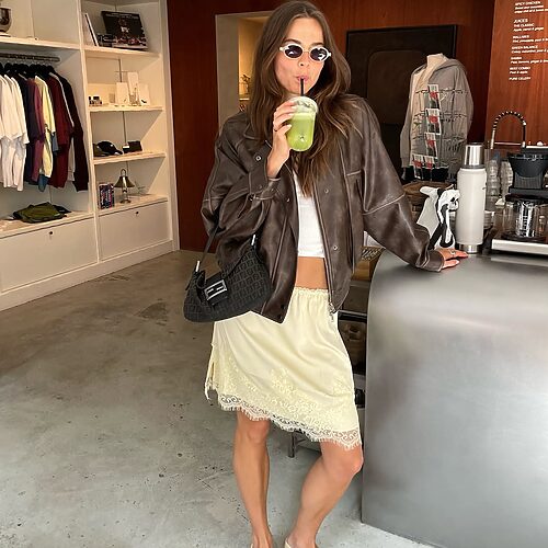 오피스 룩의 정석인 브라운 미디 스커트에 베이식한 워크 재킷을 입어보세요. 미니멀한 화이트 톱과 심플한 플립플롭을 매치해 우아함은 그대로, 힙한 감성 충만한 세련된 옷차림을 완성할 수 있습니다. 커다란 브라운 백을 드는 것도 잊지 마세요.