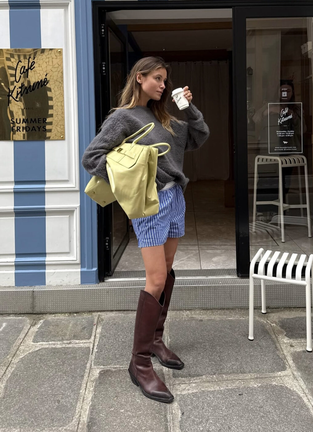옷이 아닌 액세서리를 활용해도 좋아요. 그 중에서도 브라운 부츠의 매력은 무궁무진합니다. 복서 쇼츠에 웨스턴 스타일의 브라운 롱 부츠를 신고 오버사이즈의 회색 니트 하나로 힙한 분위기를 연출했어요. 클러치처럼 연출한 토트 백으로 에지를 더했어요.