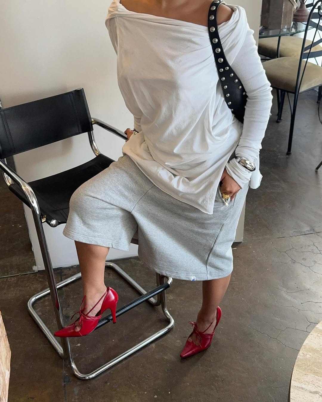 농구 바지는 의외로 다양한 무드로 연출이 가능합니다. 원 숄더나 드레이핑 톱 같은 드라마틱한 디테일의 톱과 함께한다면 우아한 분위기까지 더할 수 있죠. 이때 쨍한 컬러나 패턴이 들어간 팬츠 대신 무채색의 깔끔한 아이템으로 고른다면 이질감 없이 세련된 룩이 완성될 거예요.