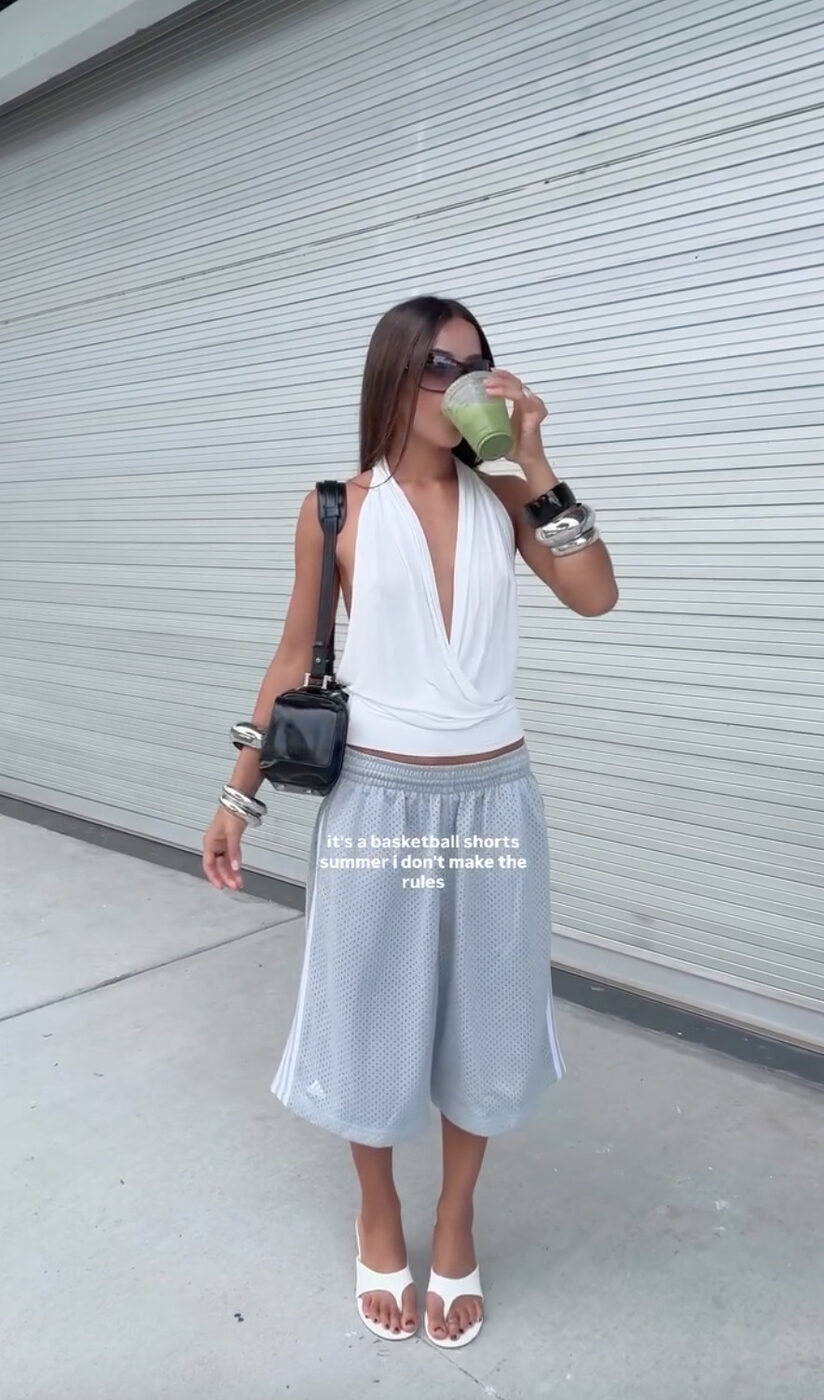 농구 바지는 로 라이즈로 입었을 때 그 매력이 배가 됩니다. 큰 사이즈의 팬츠를 골반에 걸쳐 입거나 팬츠의 밴드를 한번 접어 주기만 하면 그만이죠. 로 라이즈 팬츠와 짝꿍인 스트릿한 무드의 크롭 톱과 매치해도 좋고, 허리가 드러나는 컷 아웃 보디 슈트나 비키니 셋업과도 쿨한 케미를 자랑합니다.