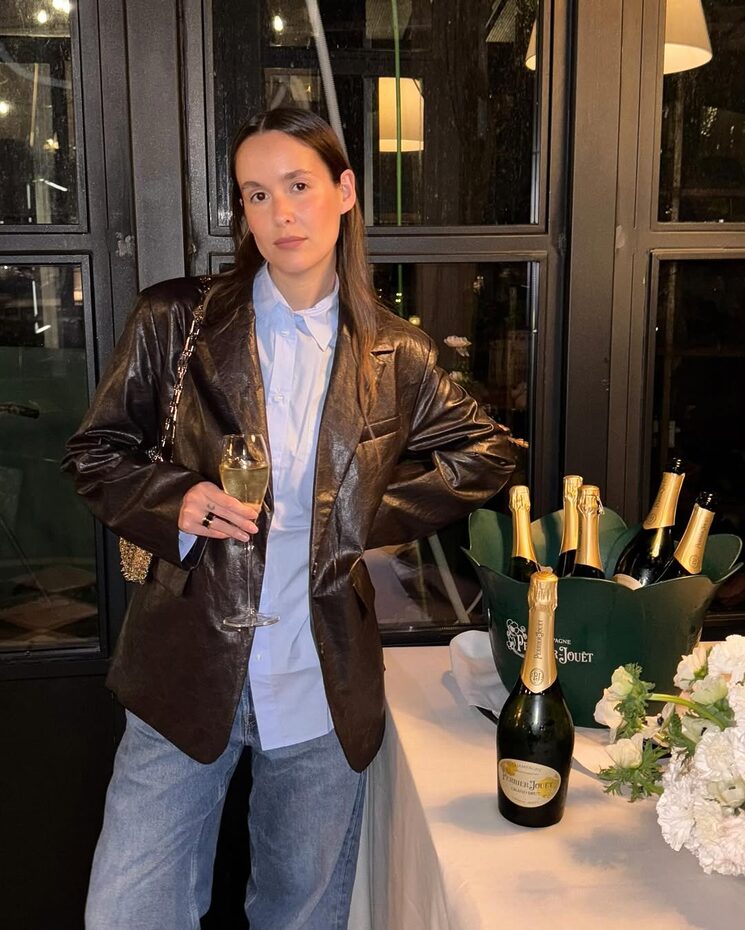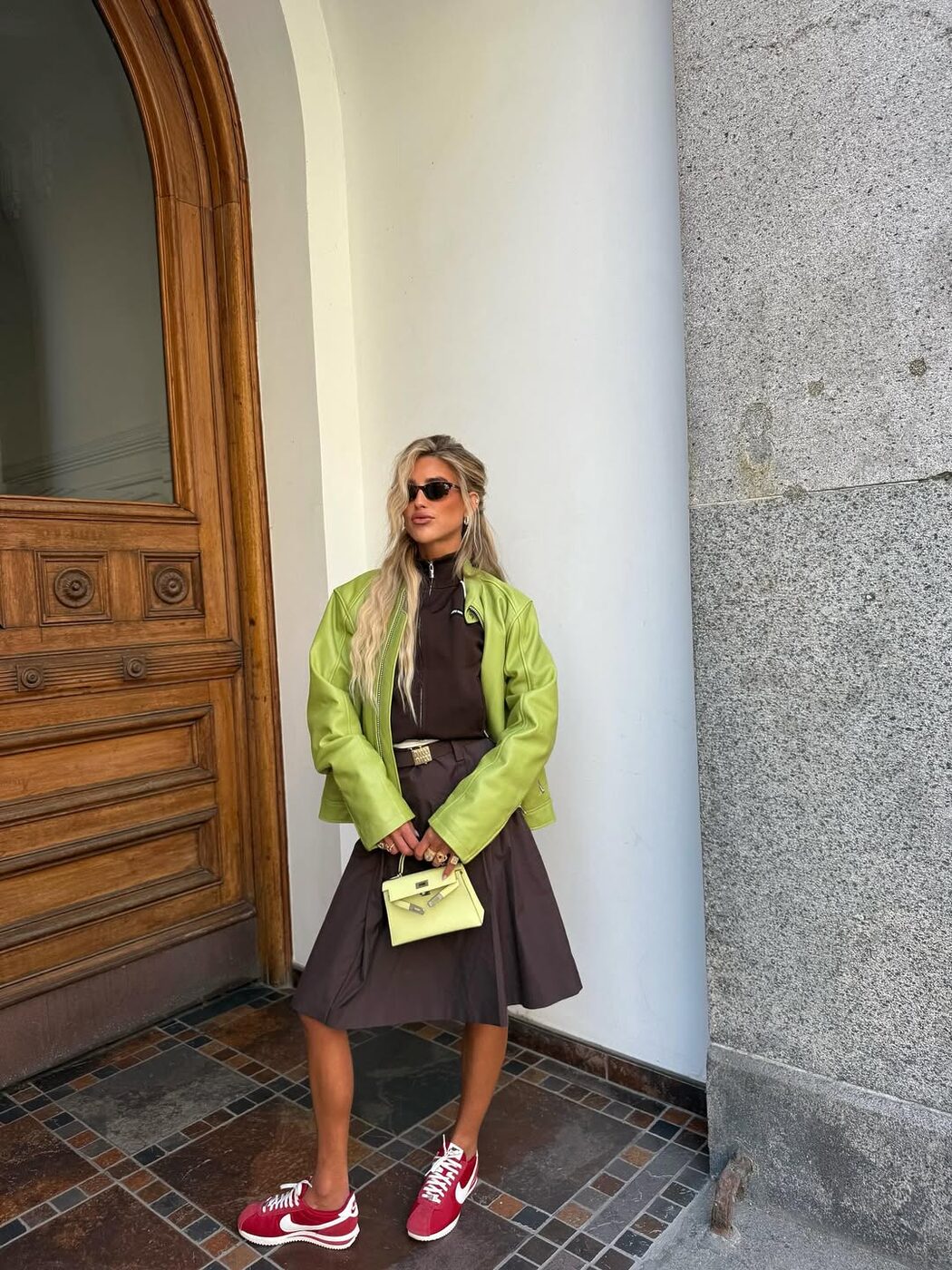 한 번쯤 예상을 벗어나 봅시다. 컬러를 입은 레더 재킷은 그 자체로 분위기를 환기할 수 있다는 팁을 기억하세요. 패션 인플루언서이자 스타일리스트인 에밀리 신들레브는 라임 그린 레더 재킷에 차분한 브라운 톱과 스커트를 매치해 색감의 대비를 살리고, 레드 스니커즈로 예상치 못한 포인트를 더했군요. 역시 패셔니스타다운 센스 있는 컬러 플레이를 시도했네요!
