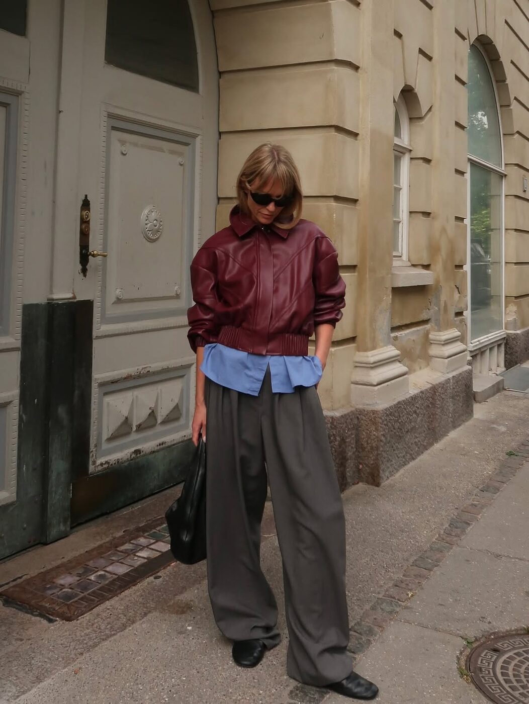 분위기 있는 와인 컬러 재킷에 블루 셔츠를 레이어드하고, 여기에 가벼운 소재의 와이드 팬츠를 더한 센스가 돋보입니다. 캐주얼한 아우터에도 클래식한 하의를 매치하면 출근할 때도 멋스럽게 입기 좋은 오피스 룩이 완성되죠.