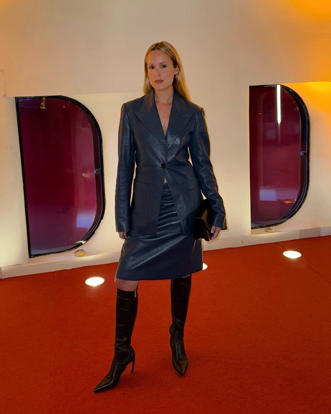 레더 소재의 재킷과 스커트로 완성한 멋스러운 셋업 룩! 이때 스틸레토 힐 대신 날렵한 실루엣의 부츠를 더하면 시크하고 당당한 무드가 완성됩니다. 특별한 저녁 모임에서도 시선을 사로잡을만한 멋스러운 아웃핏이 될 겁니다.