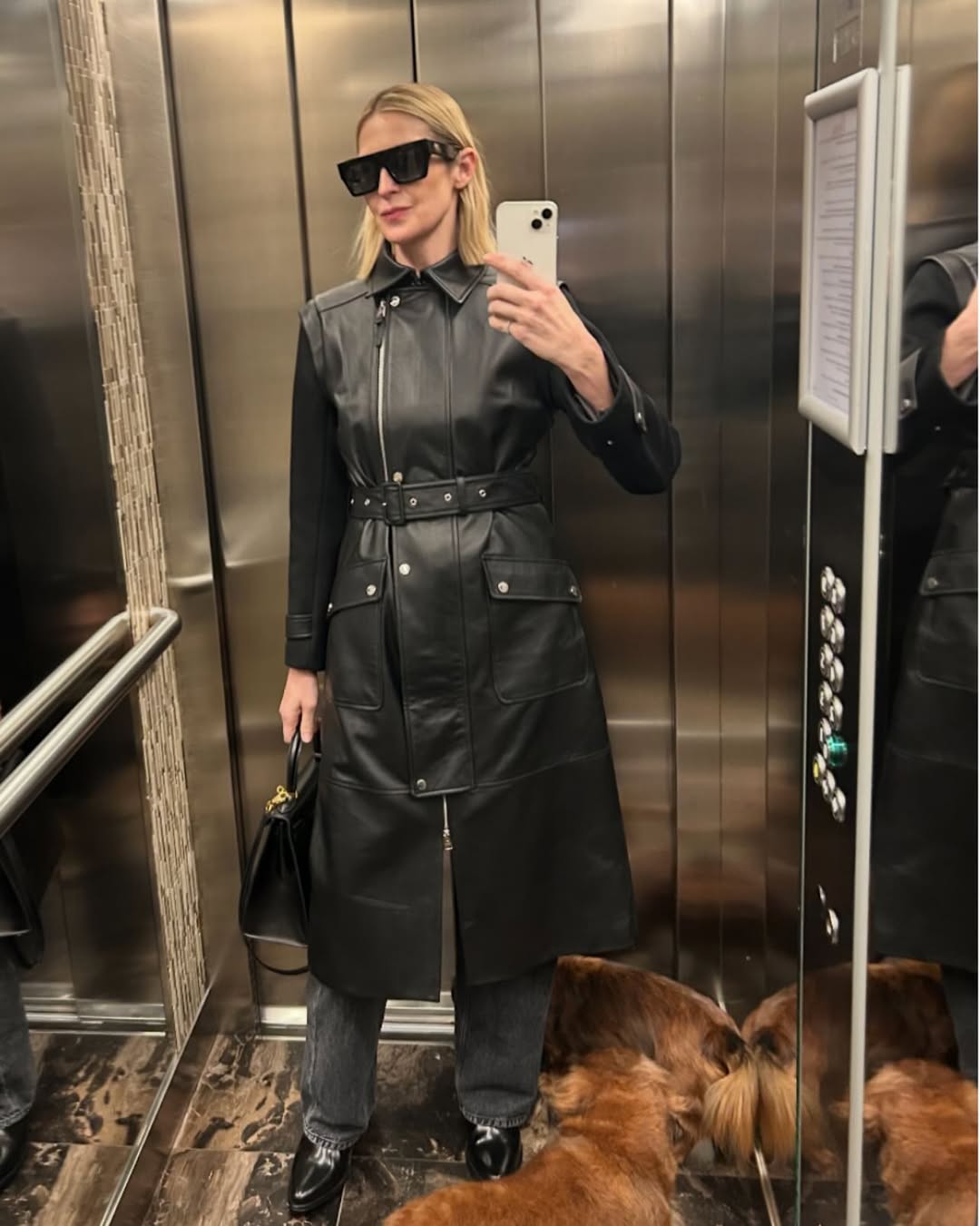 허리 선을 잡아줌으로써 직선적인 동시에 페미닌한 무드를 장착한 벨티드 레더 재킷은 의외로 유행에 휘둘리지 않는 아이템입니다. 켈리 러더포드는 그녀의 SNS 트레이드마크인 엘리베이터 셀피를 통해 시크한 올블랙 룩을 기록했군요. 블랙 데님과 슈즈 그리고 백까지 같은 톤으로 맞추면 과하지 않으면서도 강렬한 스타일이 완성된다는 팁을 엿볼 수 있습니다. 여기에 볼드한 선글라스로 에지 있는 마무리까지!