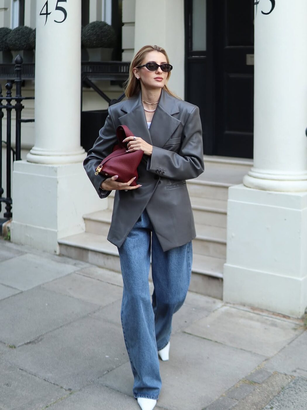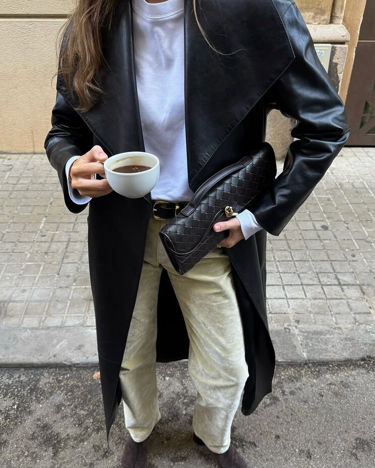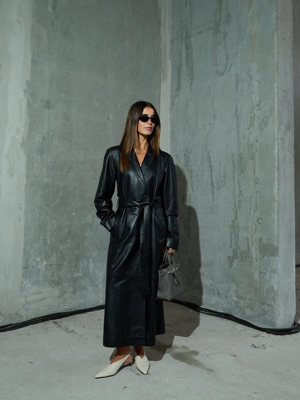 가죽 특유의 묵직함을 우아하게 풀어내는 비결은 바로 벨트입니다. 허리 라인을 묶어 드레스처럼 연출한 벨티드 레더 코트에 한결 포멀 한 분위기를 완성할 그레이 백과 화이트 슈즈를 더하면 어떨까요? 힘 있는 텍스처의 가죽 위로 여성스러운 매력을 느낄 수 있을 겁니다.