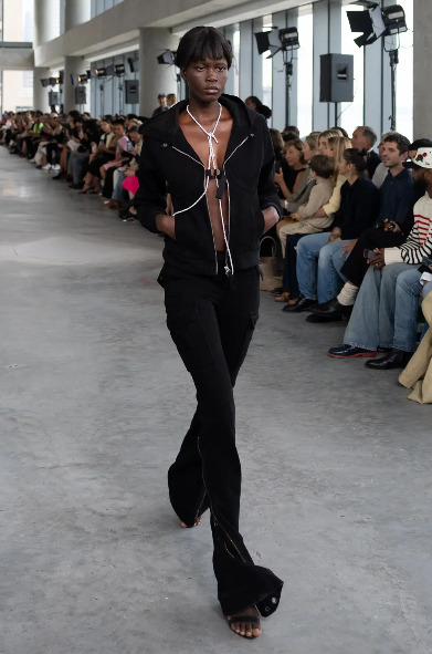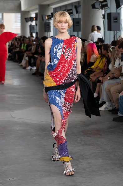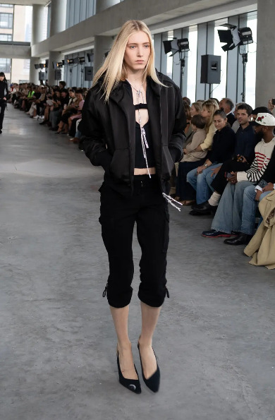 아레아는 컬렉션에 앞서 인스타그램 계정에 1980년대 뉴욕의 유명 나이트클럽이자 브랜드의 영감이 된 ‘아레아’의 옛 광고를 게재했다. 그리고 인비테이션으로 ‘꽝 없는’ 스크래치 카드와 동전을 넣어 보내며 컬렉션에 대한 기대감을 높였다. 오프닝을 연 모델은 반짝이는 새틴 소재로 만든 집업 후디, 크리스털 지퍼 장식을 단 크롭 톱, 경쾌한 페달 푸셔 쇼츠(pedal pusher shorts)를 올 블랙으로 입고 등장했다. 2026 SS 시즌, 아레아는 아이코닉한 파티 걸 스타일에 뉴욕 패션의 코드인 ‘모노크롬’과 ‘스포티함’을 더했다. 가슴에 섹시한 언더와이어를 장착한 러닝 톱, ‘NEW YORK’을 필기체로 새긴 블랙 티셔츠, 실크를 믹스매치한 데님 스커트와 팬츠, 반짝이는 크리스털로 연출한 본디지 톱과 미니 스커트, 농구 유니폼을 조각조각 이어 붙인 스팽글 드레스, 그리고 치어리더의 폼폼에서 영감을 받은 백 등은 벨라 하디드(Bella Hadid), 찰리 XCX(Charli XCX)처럼 과감한 믹스매치를 즐기는 셀럽의 스타일을 떠오르게 했다. 한편, 남성용 턱시도를 재해석한 오버사이즈 블레이저와 맥시 스커트, 아방가르드한 드레스 시리즈는 니콜라스 애번이 몸담았던 곳이 바로 발렌시아가 오트 쿠튀르였음을 상기시켰다.