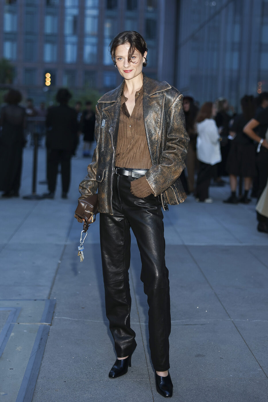 9월 13일 케이트 쇼에 참석한 루이자. 전체적으로 브라운 컬러와 가죽 소재로 터프한 가을 여자의 룩을 완성했습니다. 상하의를 모두 가죽으로 입었지만 재킷과 팬츠간 컬러 차이를 두어 답답하고 무거운 느낌을 탈피했어요. 이너 톱의 단추를 두어개 풀은 디테일도 완성도 있네요.