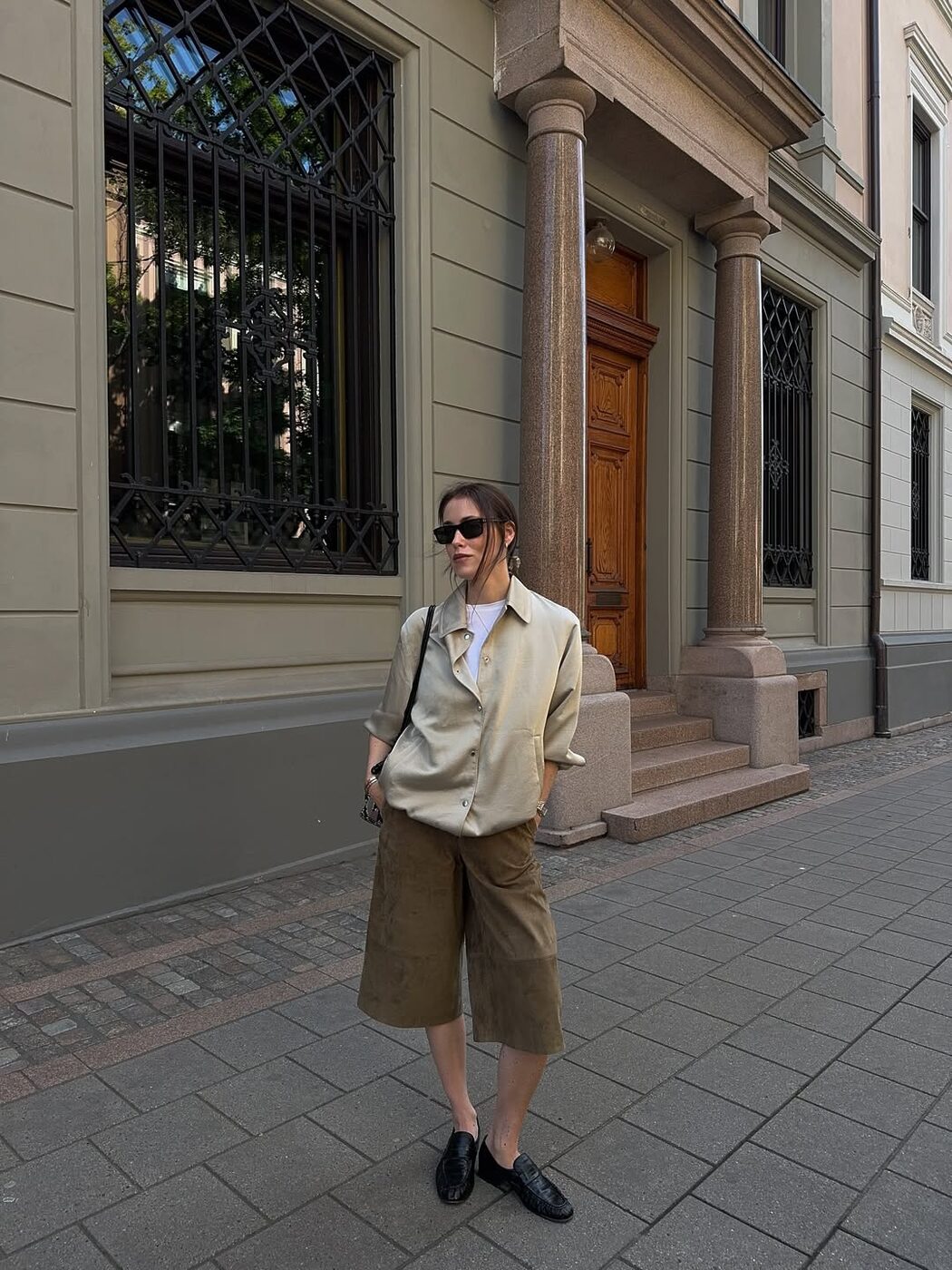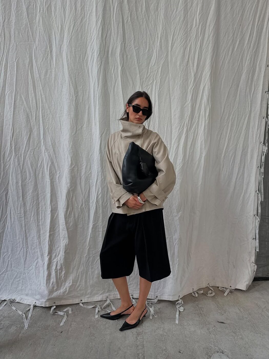 바람막이 재킷과 반바지를 함께 입으면 간절기부터 초가을까지 세련되고 실용적인 스타일이 완성됩니다. 가볍게 떨어지는 바람막이나 미니멀한 라이트 재킷은 여유로운 실루엣의 버뮤다 쇼츠와 자연스럽게 어우러져 편안하면서도 깔끔한 분위기를 만들어 주죠. 블랙 로퍼나 슬링백 힐처럼 단정한 슈즈를 매치하면 도시적인 무드가 한층 살아나고, 재킷은 단추를 잠가 셔츠처럼 단정히 입거나 살짝 풀어 이너를 드러내면 또 다른 느낌을 연출할 수 있습니다.