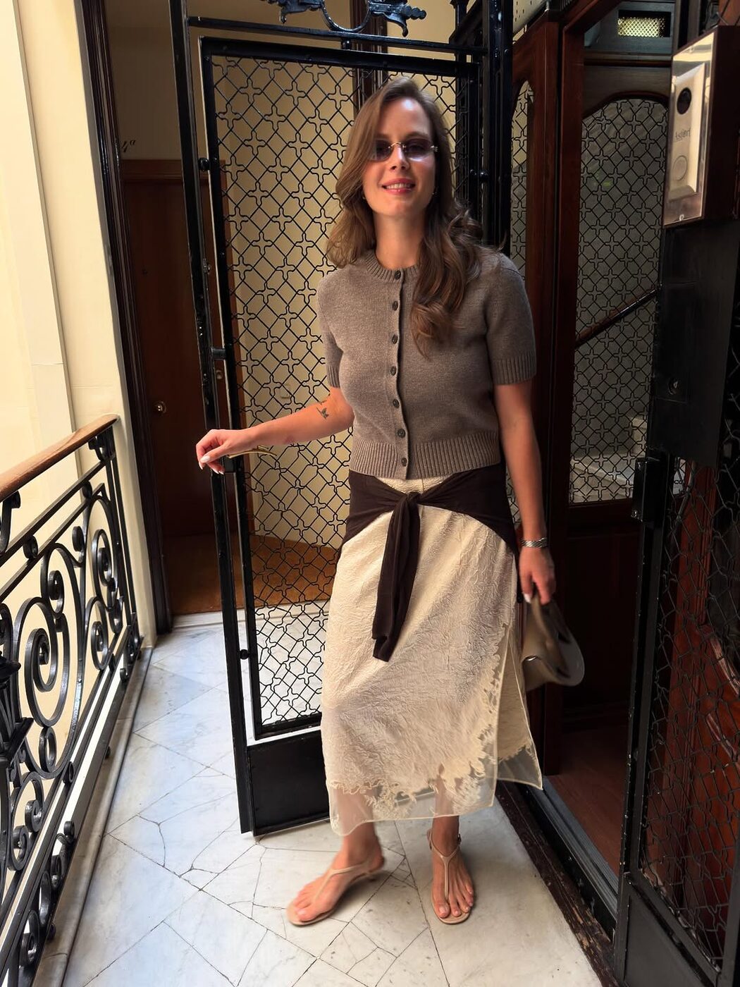 가디건을 니트처럼 단독으로 입는 스타일도 좋은 아이디어입니다. 스커트와 함께 매치하면 한층 부드럽고 우아한 분위기가 살아납니다.
