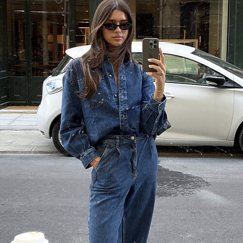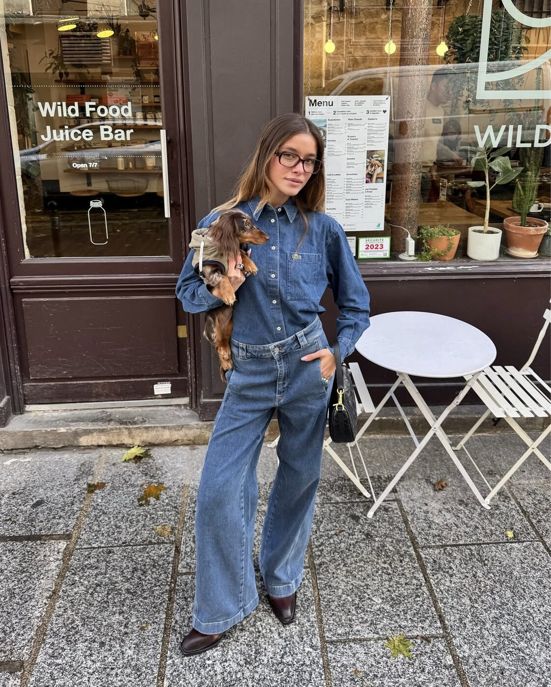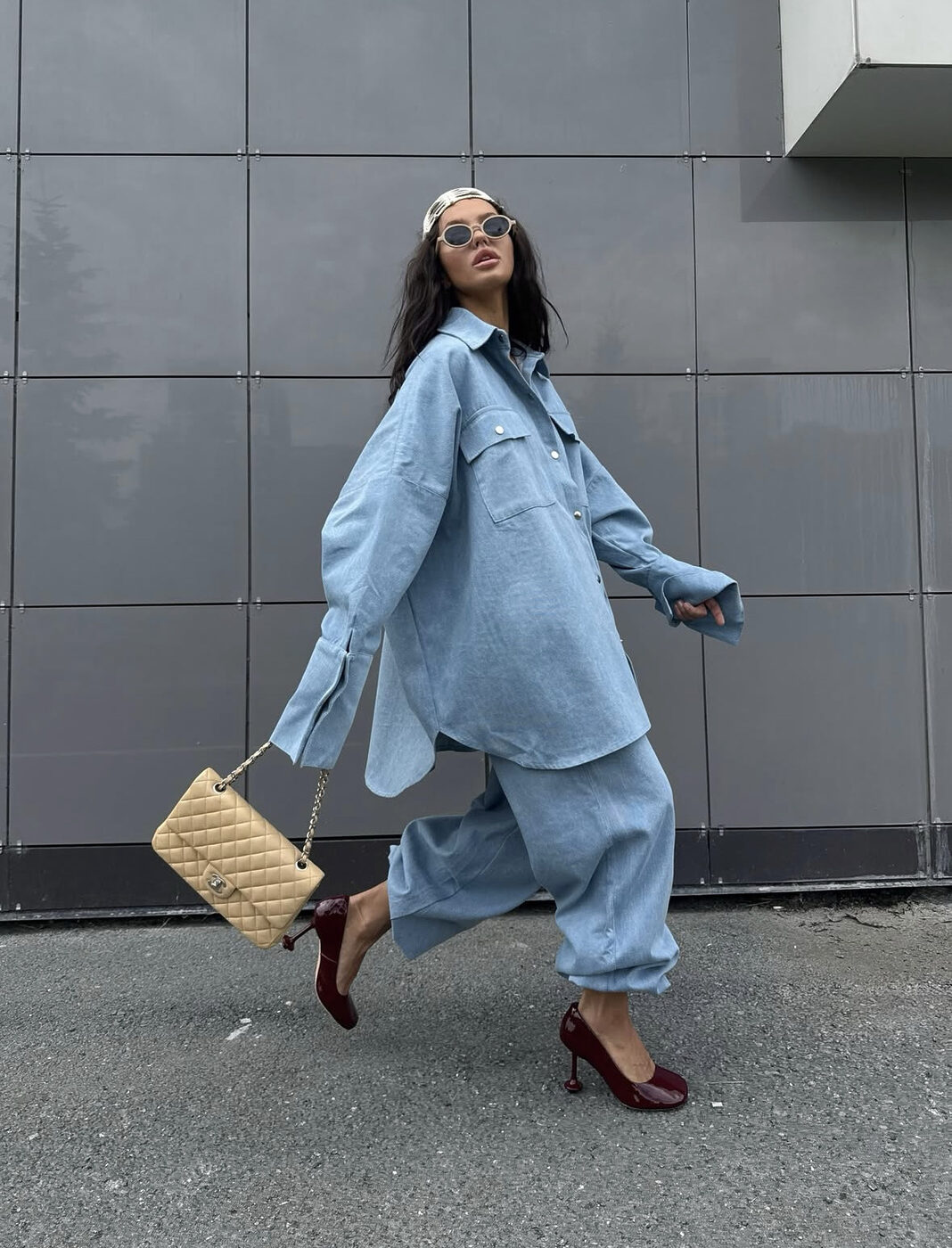 연청도 이 리스트에서 빠질 수 없습니다. 다만 올가을은 이렇게 드라마틱한 실루엣의 청청을 시도해보는 건 어떨까요? 오버사이즈 셔츠와 벌룬핏의 와이드 팬츠로 단조로울 수 있는 연청을 입체적으로 풀어내보는 겁니다. 가방과 슈즈 선택도 눈여겨볼 만합니다. 클래식한 샤넬 퀼팅 백과 와인 컬러의 펌프스를 더해 전체적으로는 과하지 않으면서 힘 있는 룩이 완성됐네요.