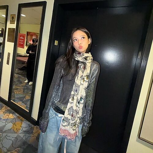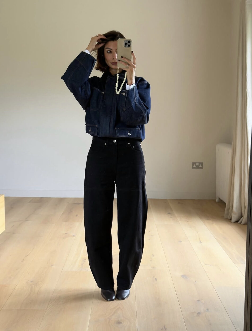 앞서 소개한 룩들처럼 톤을 꼭 통일하지 않아도 됩니다. 컬러감이 달라도 어색할 건 없으니까요. 짧은 기장의 진청재킷에 배럴 핏 흑색 청바지를 매치한 이 룩이 그 증거죠. 위아래가 같은 톤으로 이어지지 않아도, 루즈한 실루엣과 무심한 핏 덕분일까요? 멋스럽죠. 청청이라기보다는 자연스럽게 믹스매치한 듯 보여, 과한 느낌 없이 세련된 인상을 주기도 합니다. 결국 중요한 건 톤이 아니라, 아이템의 실루엣과 여유감일지도 모르겠네요.