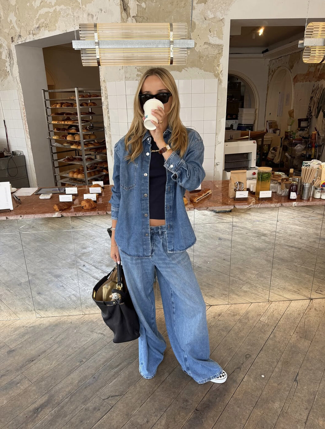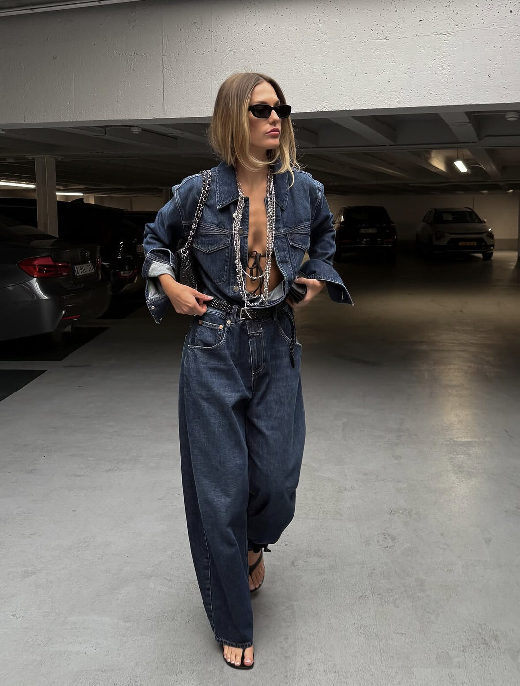 청청 패션에서 가장 중요한 것은 컬러감과 핏입니다. 위아래 톤을 통일하면 자칫 답답해보일 수 있는 단점이 있는데요. 그럴 땐 이 룩처럼 이너로 브라탑을 입고 활짝 열어 경쾌함을 살려보세요. 허리 선을 잡아줄 수 있는 벨트와 쿨한 실버 액세서리를 레이어드해도 좋겠죠. 바지는 품이 넉넉하지만 너무 빳빳하지 않은 질감으로 여유로운 핏을 자랑하고요. 청청의 올드한 이미지가 순식간에 트렌디하게 바꿔질겁니다.