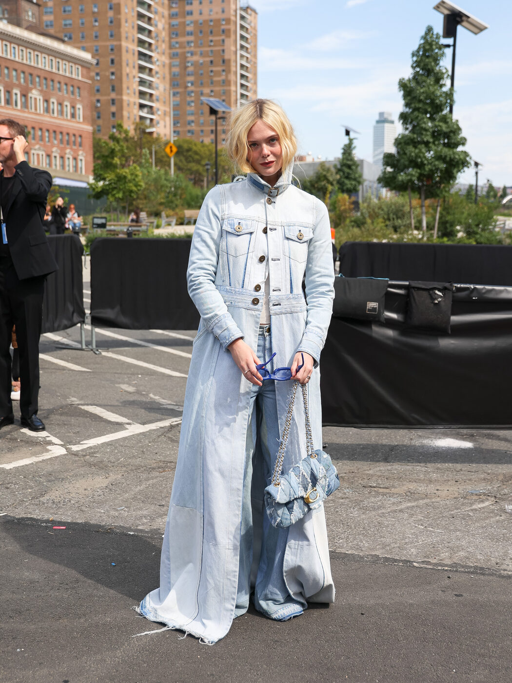 청청이 촌스럽다는 말은 옛말일 수 있겠어요. 코치 쇼에 참석한 엘르 패닝은 머리부터 발끝까지 온통 데님으로 물들였습니다. 그것도 아이시한 청으로 말이죠. 바닥을 스칠 만큼 긴 기장의 데님 트렌치 코트에 와이드 데님 팬츠를, 태비 백까지 데님 패치워크 디자인을 선택했습니다. 청청의 전형을 그대로 따르면서도, 아이템 하나하나가 변주된 덕분에 또 클래식한 청청 패션과는 거리가 멀죠.