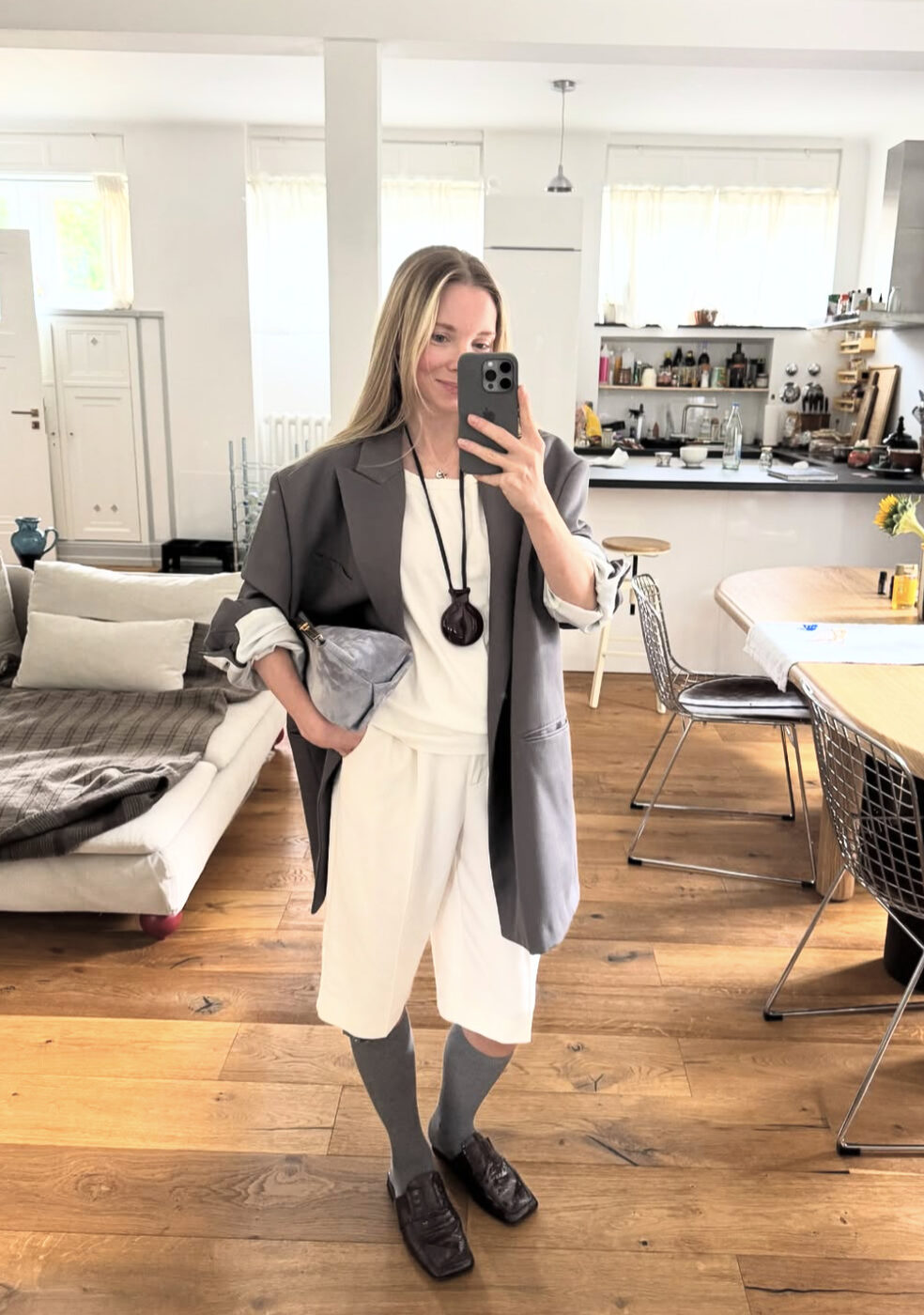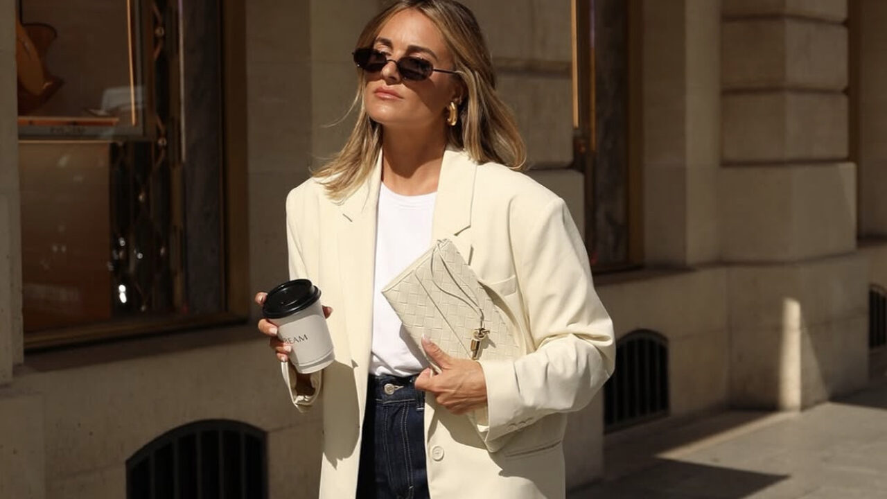 환절기에 가장 유용한 반바지와 블레이저의 매칭은 오피스 룩으로 입기에도 손색없죠. 데님 쇼츠에 화이트 티셔츠, 그리고 화이트 재킷과 슈즈까지 화이트로 완성한 옷차림에는 숄더 백이나 토트 백 대신 화이트 클러치백으로 세련된 포인트를 줬습니다. 그레이 재킷에는 마찬가지로 그레이 톤의 클러치 백을 들어 준다면 평범한 매니시 룩 또한 시크하고 드레시하게 연출할 수 있어요.