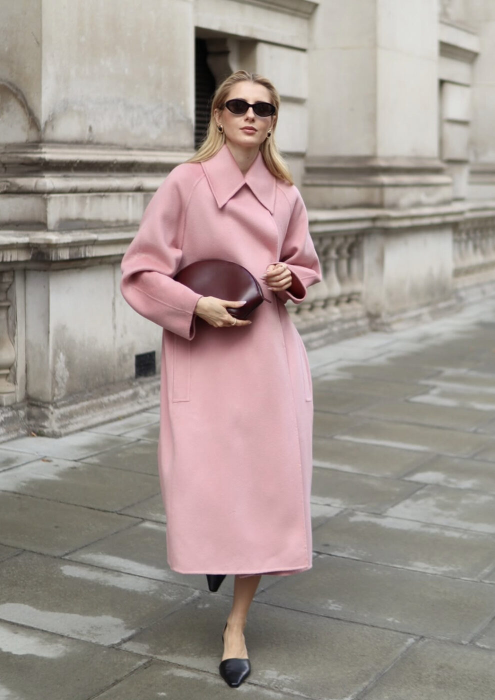 분위기를 화사하게 바꿔볼까요? 겨울까지 활용가능한 핑크색 롱 코트는 그 자체만으로 로맨틱한 무드를 완성하죠. 심플한 플랫 슈즈와 매칭해도 좋을 이 사랑스러운 컬러에는 같은 컬러 계열의 버건디 클러치 백을 매치해 보세요. 라운드 형태의 모던한 디자인에 핑크를 바탕으로 한 와인 빛 컬러가 더욱 돋보이며 우아함을 선사합니다.